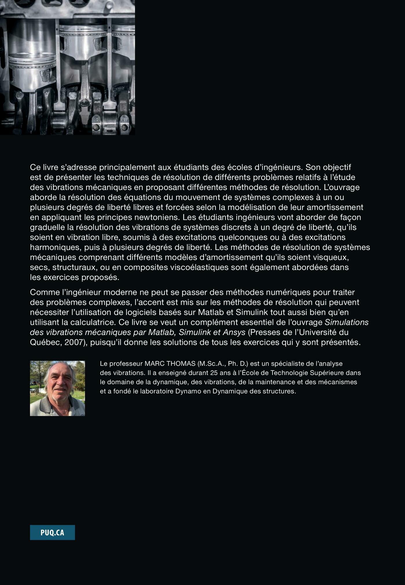 Ce livre s’adresse principalement aux étudiants des écoles d’ingénieurs. Son objectif est de présenter les techniques de résolution de différents problèmes relatifs à l’étude des vibrations mécaniques en proposant différentes méthodes de résolution. L’ouvrage aborde la résolution des équations du mouvement de systèmes complexes à un ou plusieurs degrés de liberté libres et forcées selon la modélisation de leur amortissement en appliquant les principes newtoniens. Les étudiants ingénieurs vont aborder de façon graduelle la résolution des vibrations de systèmes discrets à un degré de liberté, qu’ils soient en vibration libre, soumis à des excitations quelconques ou à des excitations harmoniques, puis à plusieurs degrés de liberté. Les méthodes de résolution de systèmes mécaniques comprenant différents modèles d’amortissement qu’ils soient visqueux, secs, structuraux, ou en composites viscoélastiques sont également abordées dans les exercices proposés.Comme l’ingénieur moderne ne peut se passer des méthodes numériques pour traiter des problèmes complexes, l’accent est mis sur les méthodes de résolution qui peuvent nécessiter l’utilisation de logiciels basés sur Matlab et Simulink tout aussi bien qu’en utilisant la calculatrice. Ce livre se veut un complément essentiel de l’ouvrage Simulations des vibrations mécaniques par Matlab, Simulink et Ansys (Presses de l’Université du Québec, 2007), puisqu’il donne les solutions de tous les exercices qui y sont présentés.Le professeur Marc Thomas (M.Sc.A., Ph. D.) est un spécialiste de l’analyse des vibrations. Il a enseigné durant 25 ans à l’École de Technologie Supérieure dans le domaine de la dynamique, des vibrations, de la maintenance et des mécanismes et a fondé le laboratoire Dynamo en Dynamique des structures.