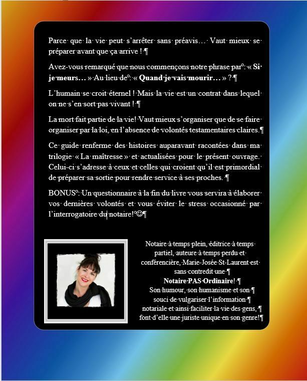 Parce que la vie peut s’arrêter sans préavis… Vaut mieux se préparer avant que ça arrive ! Avez-vous remarqué que nous commençons notre phrase par : « Si je meurs… » Au lieu de : « Quand je vais mourir… » ? L’humain se croit éternel ! Mais la vie est un contrat dans lequel on ne s’en sort pas vivant ! La mort fait partie de la vie! Vaut mieux s’organiser que de se faire organiser par la loi, en l’absence de volontés testamentaires claires.Ce guide renferme des histoires auparavant racontées dans ma trilogie « La maîtresse » et actualisées pour le présent ouvrage. Celui-ci s’adresse à ceux et celles qui croient qu’il est primordial de préparer sa sortie pour rendre service à ses proches. BONUS : Un questionnaire à la fin du livre vous servira à ÉLABORER VOS DERNIÈRES VOLONTÉS et vous ÉVITER LE STRESS occasionné par l’interrogatoire du notaire!