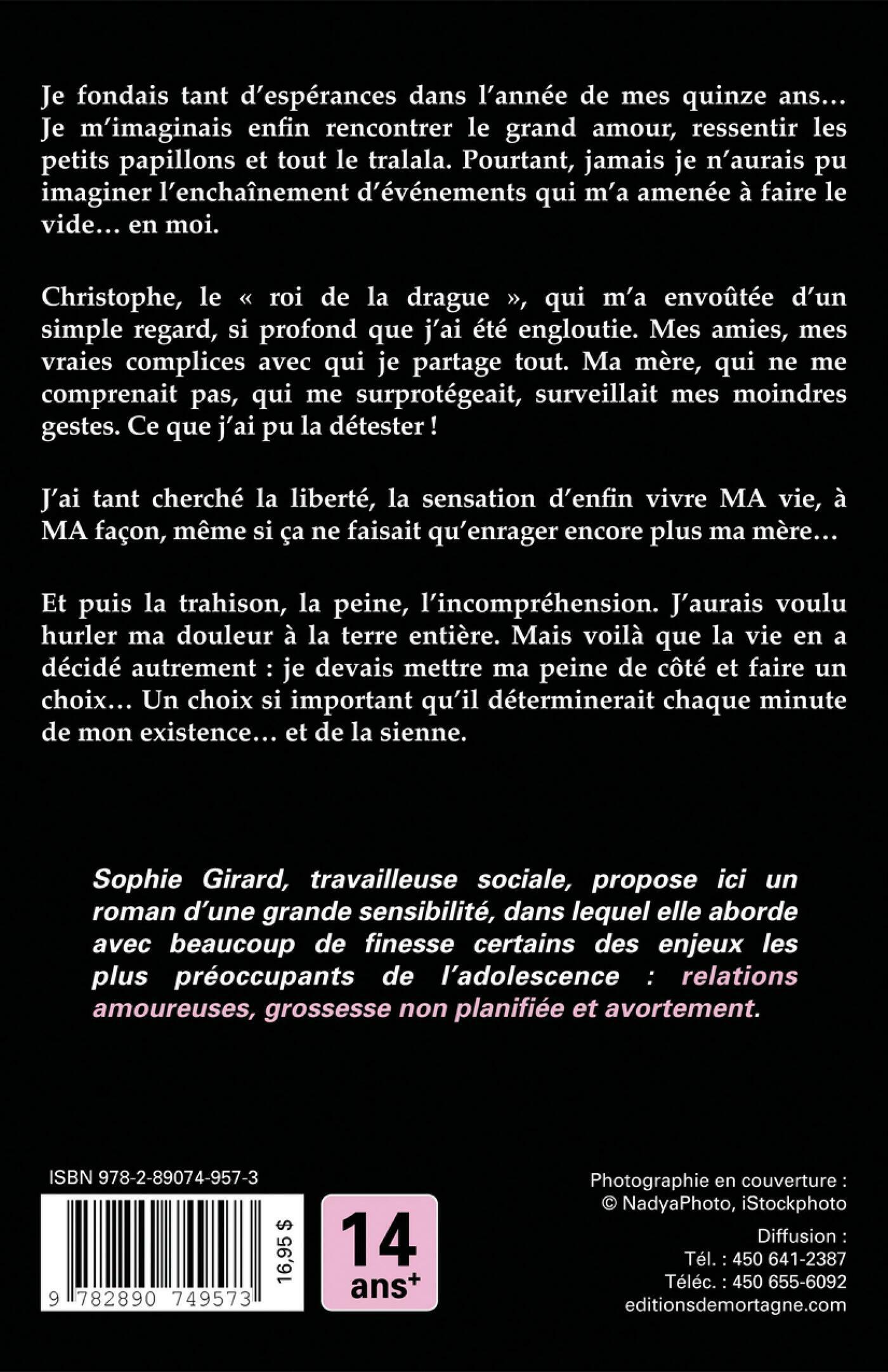 Je fondais tant d'espérances dans l'année de mes quinze ans… Je m'imaginais enfin rencontrer le grand amour, ressentir les petits papillons et tout le tralala. Pourtant, jamais je n'aurais pu imaginer l'enchaînement d'événements qui m'a amenée à faire le vide… en moi. Christophe, le « roi de la drague », qui m'a envoûtée d'un simple regard, si profond que j'ai été engloutie. Ma mère, qui ne me comprenait pas, qui me surprotégeait, surveillait mes moindres gestes. Ce que j'ai pu la détester ! J'ai tant cherché liberté, la sensation d'enfin vivre MA vie, à MA façon, même si ça ne faisait qu'enrager encore plus ma mère… Et puis, la trahison, la peine, l'incompréhension. J'aurais voulu hurler ma douleur à la terre entière. Mais voilà que la vie en a décidé autrement : je devais mettre ma peine de côté et faire un choix… Un choix si important qu'il déterminerait chaque minute de mon existence… et de la sienne. Sophie Girard, travailleuse sociale, propose ici un roman d'une grande sensibilité, dans lequel elle aborde avec beaucoup de finesse certains des enjeux les plus préoccupants de l'adolescence : les relations amoureuses, la grossesse non planifiée et l' avortement.