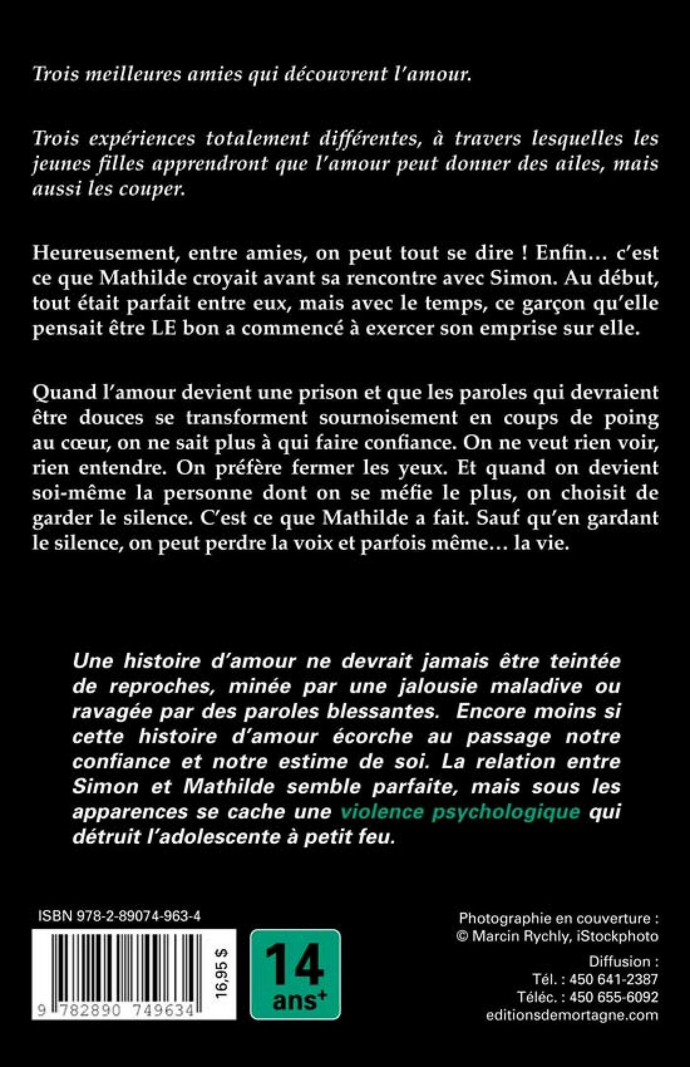 "Trois meilleures amies qui découvrent la vie et l'amour. Trois expériences totalement différentes, à travers lesquelles les jeunes filles apprendront que l'amour peut donner des ailes, mais aussi les couper. Heureusement entre amies, on peut tout se dire! Enfin… c'est ce que Mathilde croyait avant sa rencontre avec Simon. Au début, tout était parfait entre eux, mais avec le temps, ce garçon qu'elle pensait être LE bon a commencé à exercer son emprise sur elle. Quand l'amour devient une prison, que les paroles qui devraient être douces se transforment sournoisement en coups de poing au coeur, on ne sait plus à qui faire confiance. On ne veut rien voir, rien entendre. On préfère fermer les yeux. Et quand on devient soi-même la personne dont on se méfie le plus, on choisit de garder le silence. C'est ce que Mathilde a fait. Sauf qu'en gardant le silence, on peut perdre la voix et parfois même… la vie.Une histoire d'amour ne devrait jamais être teintée de reproches, minée par une jalousie maladive ou ravagée par des paroles blessantes. Encore moins si cette histoire d'amour écorche au passage notre confiance et notre estime de soi. La relation entre Simon et Mathilde semble parfaite, mais sous les apparences se cache une violence psychologique qui détruit l'adolescente à petit feu.