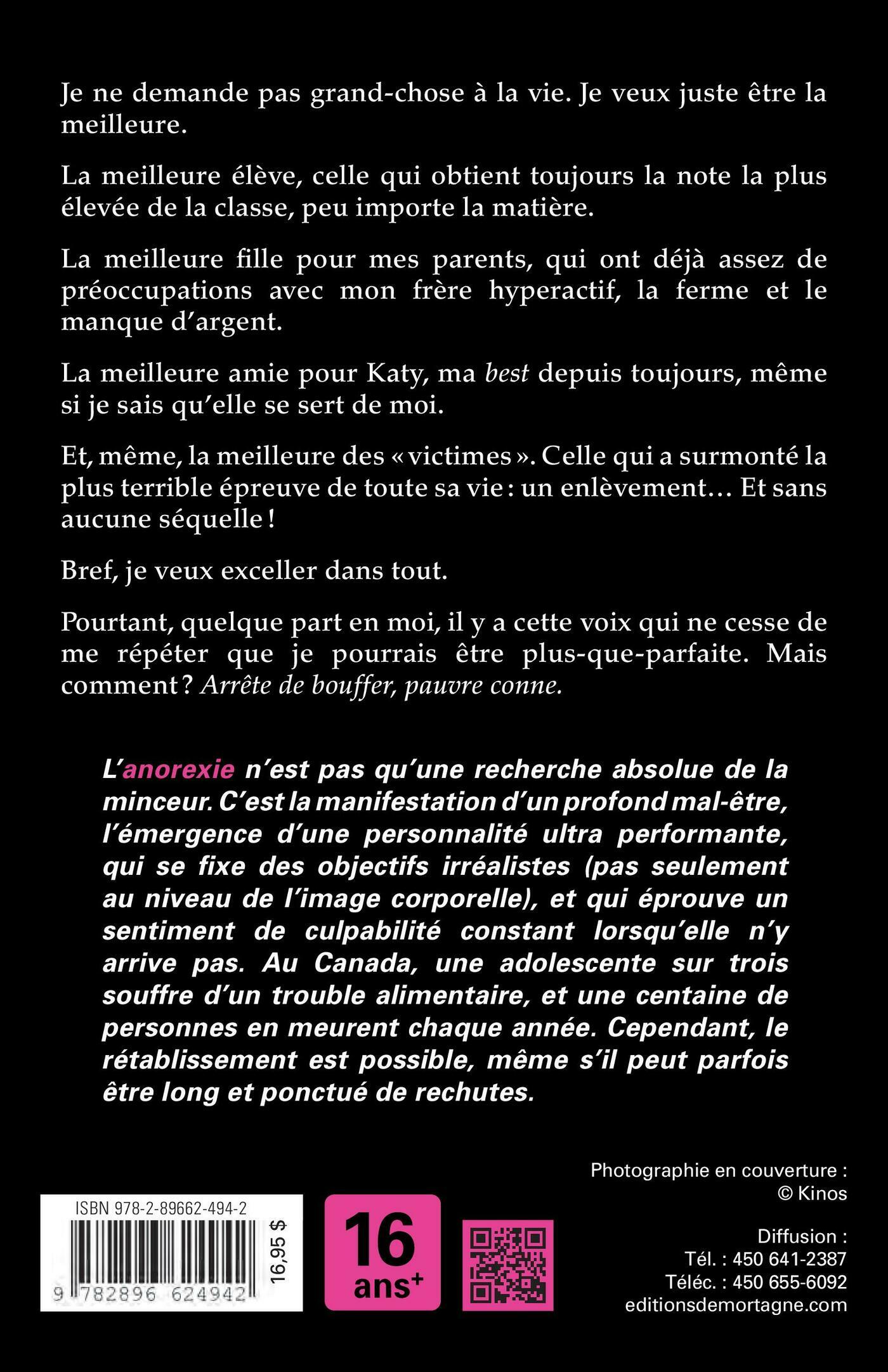 Je ne demande pas grand-chose à la vie. Je veux juste être la meilleure.La meilleure élève, celle qui obtient toujours la note la plus élevée de la classe, peu importe la matière.La meilleure fille pour mes parents, qui ont déjà assez de préoccupations avec la ferme, mon frère hyperactif et le manque d'argent. La meilleure amie pour Katy, ma best depuis toujours, même si je sais qu'elle se sert de moi. Et, même, la meilleure des « victimes ». Celle qui a surmonté la plus terrible épreuve de toute sa vie : un enlèvement… Et sans aucune séquelle ! Bref, je veux exceller dans tout. Pourtant, quelque part en moi, il y a cette voix qui ne cesse de me répéter que je pourrais être plus-que-parfaite. Mais comment ? Arrête de bouffer, pauvre conne.L’anorexie n’est pas qu’une recherche absolue de la minceur. C’est la manifestation d’un profond mal-être, l’émergence d’une personnalité ultra performante, qui se fixe des objectifs irréalistes (pas seulement au niveau de l’image corporelle), qui se pousse au-delà de ses limites pour les atteindre et qui éprouve un sentiment de culpabilité constant lorsqu’elle n’y arrive pas. Au Canada, une adolescente sur trois souffre d’un trouble alimentaire, et une centaine de personnes en meurent chaque année. Les causes de l’anorexie sont nombreuses et complexes, voire insidieuses, ce qui la rend difficile à prévenir. Cependant, le rétablissement est possible, même s’il peut parfois être long et ponctué de rechutes.