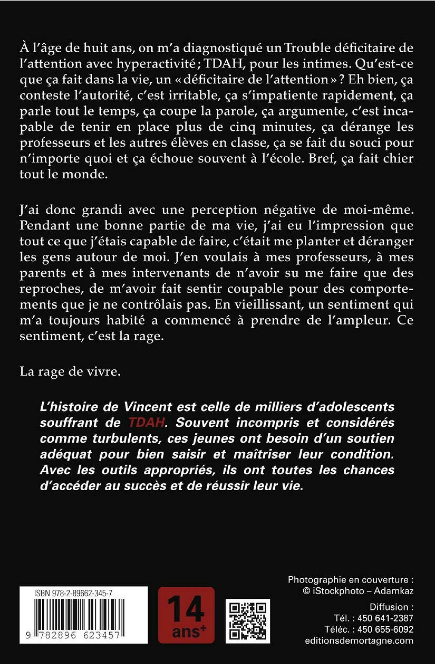 À l’âge de huit ans, on m’a diagnostiqué un Trouble déficitaire de l’attention avec hyperactivité; TDAH, pour les intimes. Qu’est-ce que ça fait dans la vie, un «déficitaire de l’attention»? Eh bien, ça conteste l’autorité, c’est irritable, ça s’impatiente rapidement, ça parle tout le temps, ça coupe la parole, ça argumente, c’est incapable de tenir en place plus de cinq minutes, ça dérange les professeurs et les autres élèves en classe, ça se fait du souci pour n’importe quoi et ça échoue souvent à l’école. Bref, ça fait chier tout le monde.J’ai donc grandi avec une perception négative de moi-même. Pendant une bonne partie de ma vie, j’ai eu l’impression que tout ce que j’étais capable de faire, c’était me planter et déranger les gens autour de moi. J’en voulais à mes professeurs, à mes parents et à mes intervenants de n’avoir su me faire que des reproches, de m’avoir fait sentir coupable pour des comportements que je ne contrôlais pas. En vieillissant, un sentiment qui m’a toujours habité a commencé à prendre de l’ampleur. Ce sentiment, c’est la rage.La rage de vivre.L’histoire de Vincent est celle de milliers d’adolescents souffrant de TDAH. Souvent incompris et considérés comme turbulents, ces jeunes ont besoin d’un soutien adéquat pour bien saisir et maîtriser leur condition. Avec les outils appropriés, ils ont toutes les chances d’accéder au succès et de réussir leur vie.