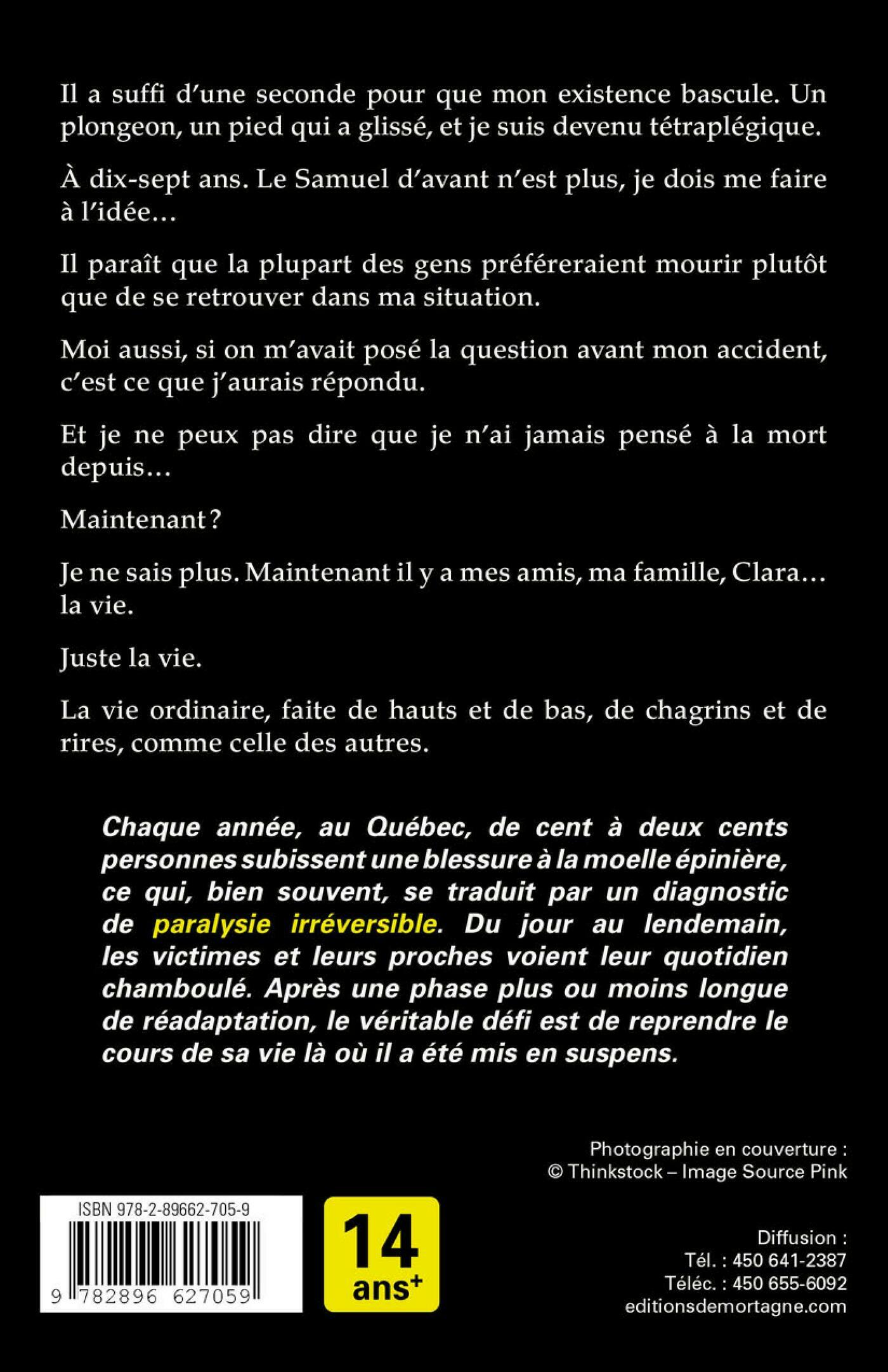Il a suffi d'une seconde pour que mon existence bascule. Un plongeon, un pied qui a glissé, et je suis devenu tétraplégique.A dix-sept ans. Le Samuel d'avant n'est plus, je dois me faire à l'idée…Il paraît que la plupart des gens préféreraient mourir plutôt que de se retrouver dans ma situation.Moi aussi, si on m'avait posé la question avant mon accident, c'est ce que j'aurais répondu.Et je ne peux pas dire que je n'ai jamais pensé à la mort depuis… Maintenant ?Je ne sais plus. Maintenant il y a mes amis, ma famille, Clara… la vie.Juste la vie.La vie ordinaire, faite de hauts et de bas, de chagrins et de rires, comme celle des autres. Chaque année, au Québec, de cent à deux cents personnes subissent une blessure à la moelle épinière, ce qui, bien souvent, se traduit par un diagnostic de paralysie irréversible. Du jour au lendemain, les victimes et leurs proches voient leur quotidien chamboulé. Après une phase plus ou moins longue de réadaptation, le véritable défi est de reprendre le cours de sa vie là où il a été mis en suspens.