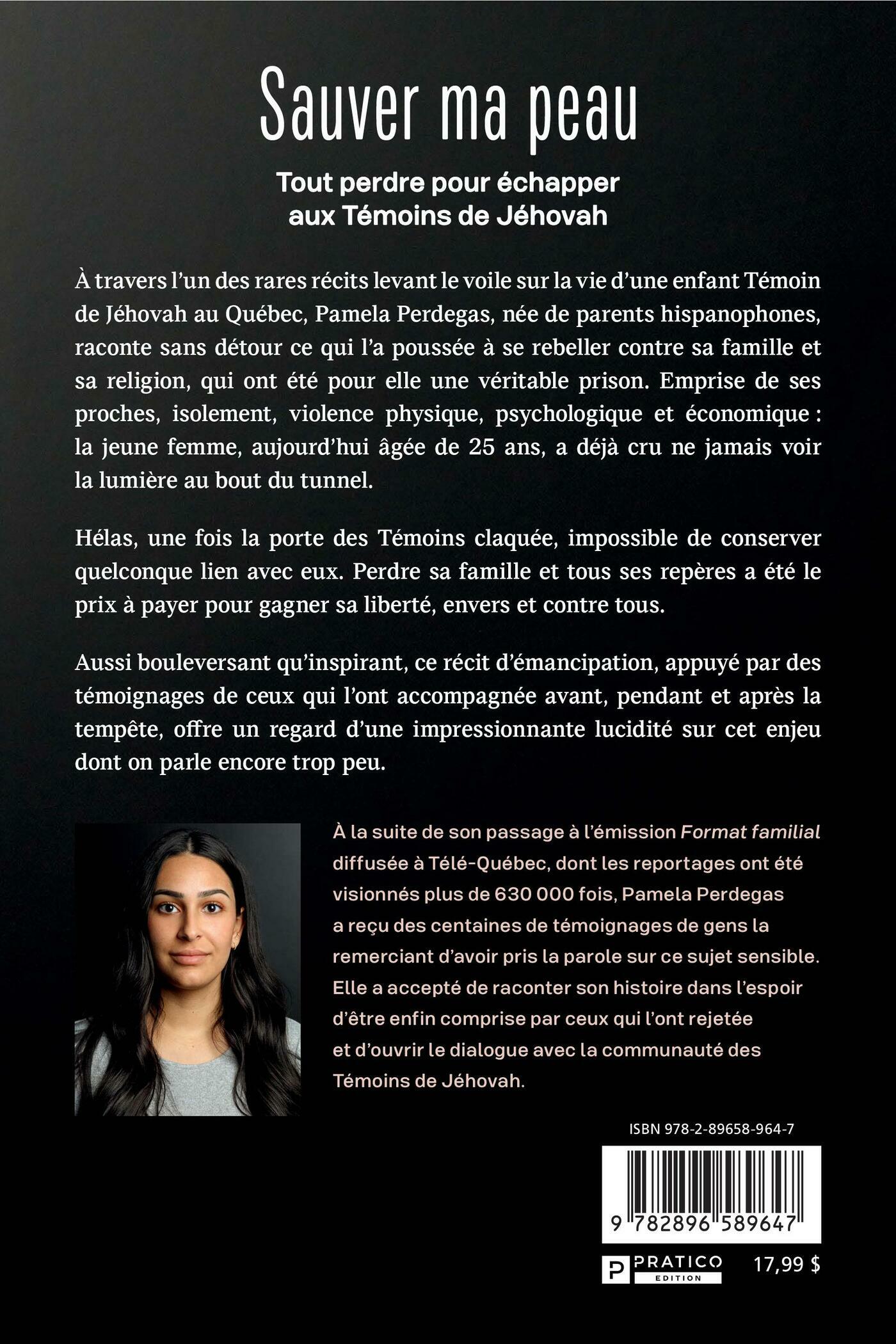 À travers l’un des rares récits levant le voile sur la vie d’une enfant Témoin de Jéhovah au Québec, Pamela Perdegas, née de parents hispanophones, raconte sans détour ce qui l’a poussée à se rebeller contre sa famille et sa religion, qui ont été pour elle une véritable prison. Emprise de ses proches, isolement, violence physique, psychologique et économique : la jeune femme, aujourd’hui âgée de 25 ans, a déjà cru ne jamais voir la lumière au bout du tunnel. Hélas, une fois la porte des Témoins claquée, impossible de conserver quelconque lien avec eux. Perdre sa famille et tous ses repères a été le prix à payer pour gagner sa liberté, envers et contre tous.Aussi bouleversant qu’inspirant, ce récit d’émancipation, appuyé par des témoignages de ceux qui l’ont accompagnée avant, pendant et après la tempête, offre un regard d’une impressionnante lucidité sur cet enjeu dont on parle encore trop peu.