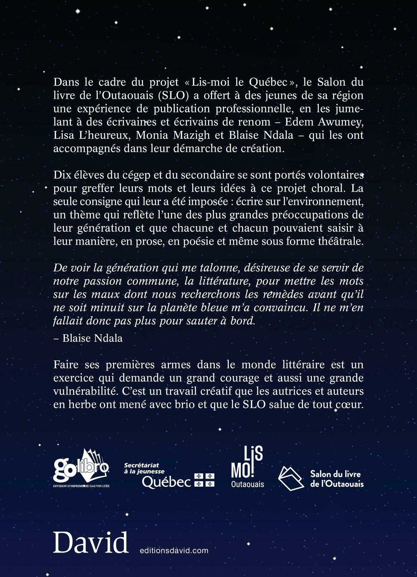 Dans le cadre du projet « Lis-moi le Québec », le Salon du livre de l’Outaouais (SLO) a offert à des jeunes de sa région une expérience de publication professionnelle, en les jumelant à des écrivaines et écrivains de renom – Edem Awumey, Lisa L’Heureux, Monia Mazigh et Blaise Ndala – qui les ont accompagnés dans leur démarche de création.Dix élèves du cégep et du secondaire se sont portés volontaires pour greffer leurs mots et leurs idées à ce projet choral. La seule consigne qui leur a été imposée : écrire sur l’environnement, un thème qui reflète l’une des plus grandes préoccupations de leur génération et que chacune et chacun pouvaient saisir à leur manière, en prose, en poésie et même sous forme théâtrale.