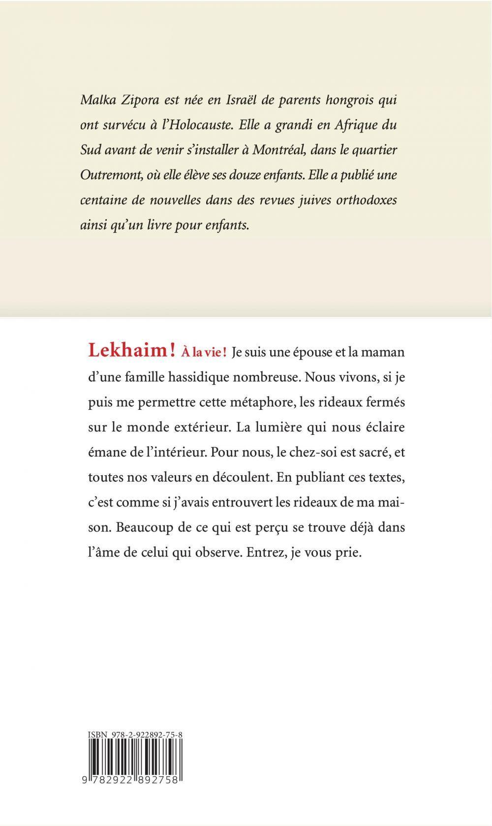Recueil de 25 courts récits, à la fois touchants et drôles, qui nous font découvrir ce petit cercle fermé de gens, nos voisins méconnus, héritiers d'une lourde tradition. Au moyen d'un lexique, le livre nous familiarise avec les coutumes des juifs hassidiques, leurs fêtes, leurs réalités des petits et des grands jours. Un univers qui intrigue, enfin vu de l'intérieur.C'est le premier ouvrage du genre, la première fois que la communauté hassidique montréalaise s'ouvre à ses voisins par la voie de la littérature. L'occasion de connaître de l'intérieur cette réalité que nous ne connaissons ni ne comprenons. Un livre à la fois humoristique et historique.