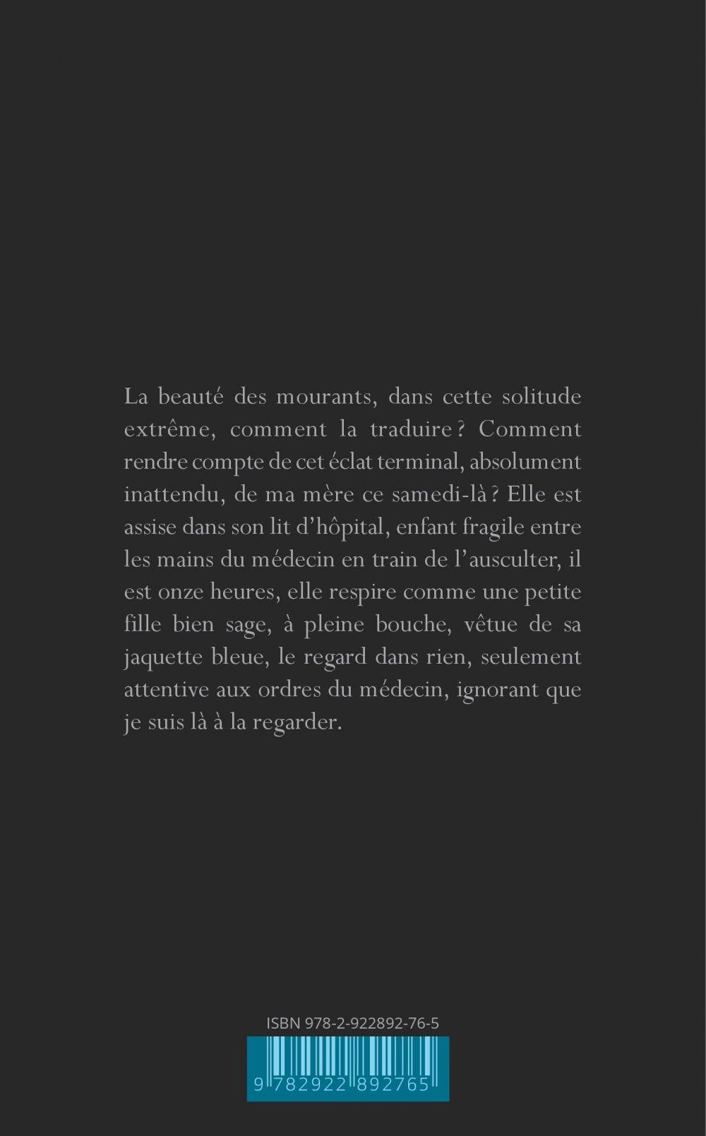 La beauté des mourants, dans cette solitude extrême, comment la traduire? Comment rendre compte de cet éclat terminal, absolument inattendu, de ma mère ce samedi-là? Elle est assise dans son lit d'hôpital, enfant fragile entre les mains du médecin en train de l'ausculter, il est onze heures, elle respire comme une petite fille bien sage, à pleine bouche, vêtue de sa jaquette bleue, le regard dans rien, seulement attentive aux ordres du médecin, ignorant que je suis là à la regarder.