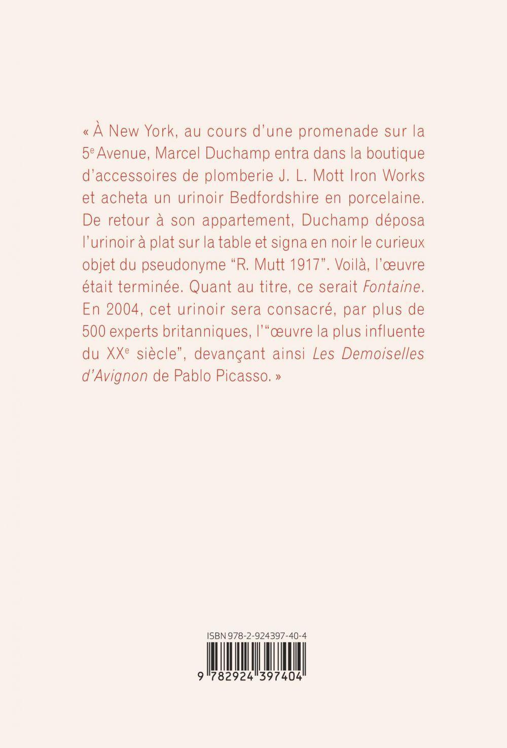 Neuvième titre de la collection Autour de l'art, Fontaine. Variations autour de l'urinoir de Marcel Duchamp retrace la folle aventure de l'objet qui a changé le monde de l'art. Michel Laverdière propose un retour sur les faits tels qu'ils se seraient produits en 1917 lors de la création de l'une des oeuvres majeures du siècle dernier : la très controversée Fontaine de Marcel Duchamp. Le livre explore quelques-unes des théories qui entourent une oeuvre d'art qui, aussi incroyable que cela puisse paraître, n'a jamais été exposée en public. D'abord refusée par le comité de sélection du salon, puis perdue ou détruite, seule une photo d'Alfred Stieglitz, parue dans le second et dernier numéro de la petite revue The Blind Man en mai 1917, atteste de son existence. Entre 1953 et 1964, seize répliques seront réalisées et exposées dans différents musées autour du monde, dont le Musée des beaux-arts du Canada à Ottawa.L'auteur Michel Laverdière offre dans cet ouvrage un récit passionnant de la création et du parcours de la Fontaine de Duchamp, ainsi qu'une réflexion sur l'art en général et des illustrations parodiques s'appuyant sur le concept du détournement, fort prisé par Duchamp. En annexe, le lecteur trouvera une traduction française inédite du Manifeste des artistes indépendants d'Henri-Pierre Roché, publié en 1917 dans The Blind Man, et dont les propos frappent par leur pertinence et leur actualité.