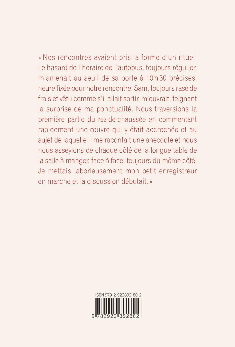 «Nos rencontres avaient pris la forme d'un rituel. Le hasard de l'horaire de l'autobus, toujours régulier, m'amenait au seuil de sa porte à 10 h 30 précises, heure fixée pour notre rencontre. Sam, toujours rasé de frais et vêtu comme s'il allait sortir, m'ouvrait, feignant la surprise de ma ponctualité. Nous traversions la première partie du rez-de-chaussée en commentant rapidement une oeuvre qui y était accrochée et au sujet de laquelle il me racontait une anecdote et nous nous asseyions de chaque côté de la longue table de la salle à manger, face à face, toujours du même côté. Je mettais laborieusement mon petit enregistreur en marche et la discussion débutait.»