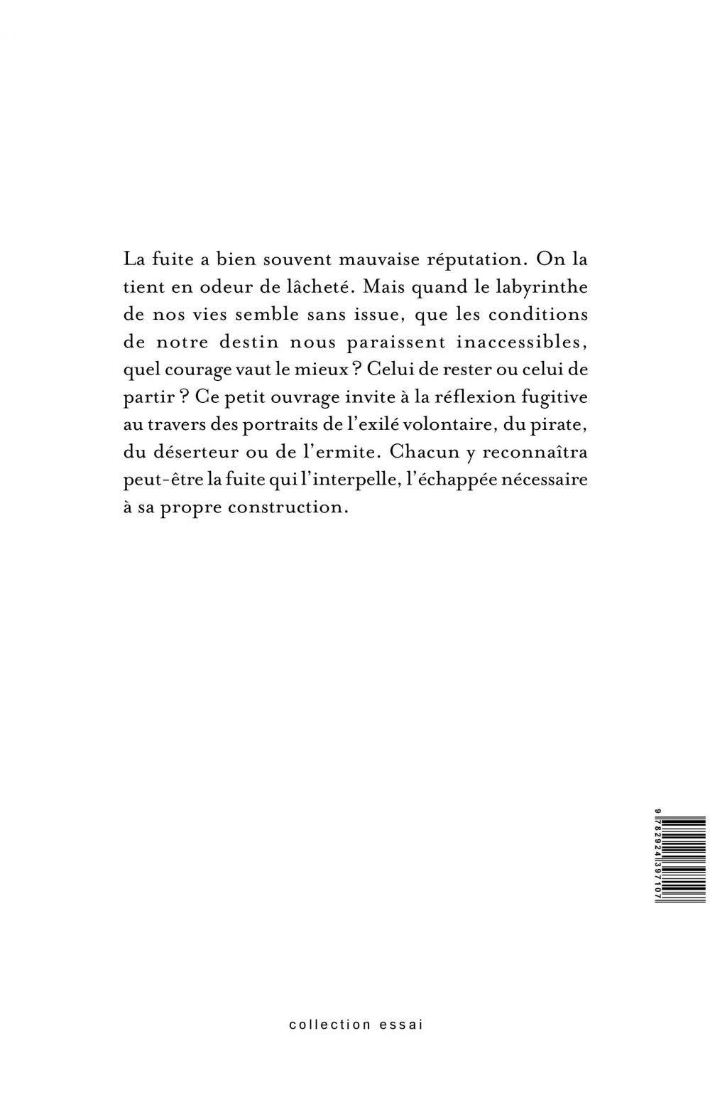 Petite géographie de la fuite est une ode aux chemins de traverse. Son auteur au parcours hors-normes nous invite à une réflexion sur la place de l'individu dans la société. Il nous entraîne sur les traces de quatre figures de fuyards : l'exilé volontaire, le pirate, le déserteur et l'ermite, dans un essai bref et accessible à tous qui se situe à la frontière des genres, entre poésie et réflexion philosophique.