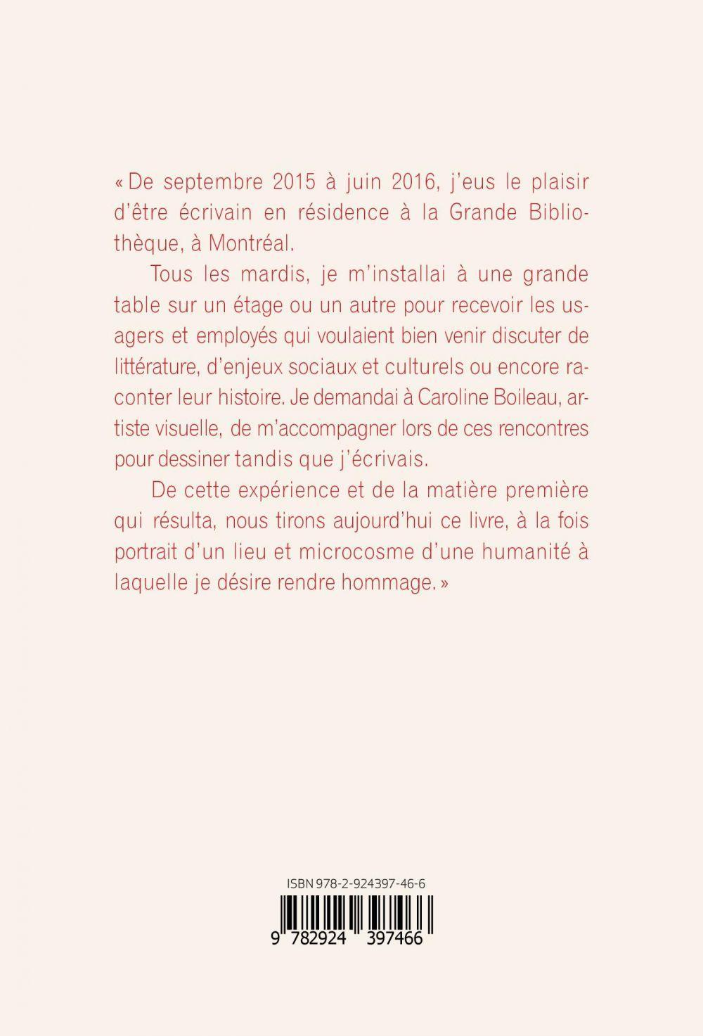 Dixième titre de la collection Autour de l'art, La Grande Baie. Portrait d'une bibliothèque est un hommage à la Grande Bibliothèque de Montréal, microcosme au cœur de la ville. Véritable déclaration d’amour à l’un des lieux vivants de la métropole, La Grande Baie nous offre une collection d’instants d’humanité d’une grande finesse.De septembre 2015 à juin 2016, dans le cadre d’une résidence d’écrivain à la Grande Bibliothèque, l’écrivain et comédien Gilbert Turp, accompagné par l’artiste multidisciplinaire Caroline Boileau, a recueilli tous les mardis les témoignages des usagers et des employés de la bibliothèque. Rédigé à la manière d’un journal intime, mais se mettant au service de la parole de l’autre, ce livre dévoile une belle et juste réflexion sur la vie d’une bibliothèque, les gens qui la fréquentent, ceux qui y travaillent, et surtout sa place essentielle dans la cité. Récits poignants, anecdotes cocasses et tendresse pour l’humain sont au rendez-vous. Superbement illustré d’aquarelles en couleur, La Grande Baie est le fruit d’une expérience hors du commun faite de rencontres et d’instantanés.