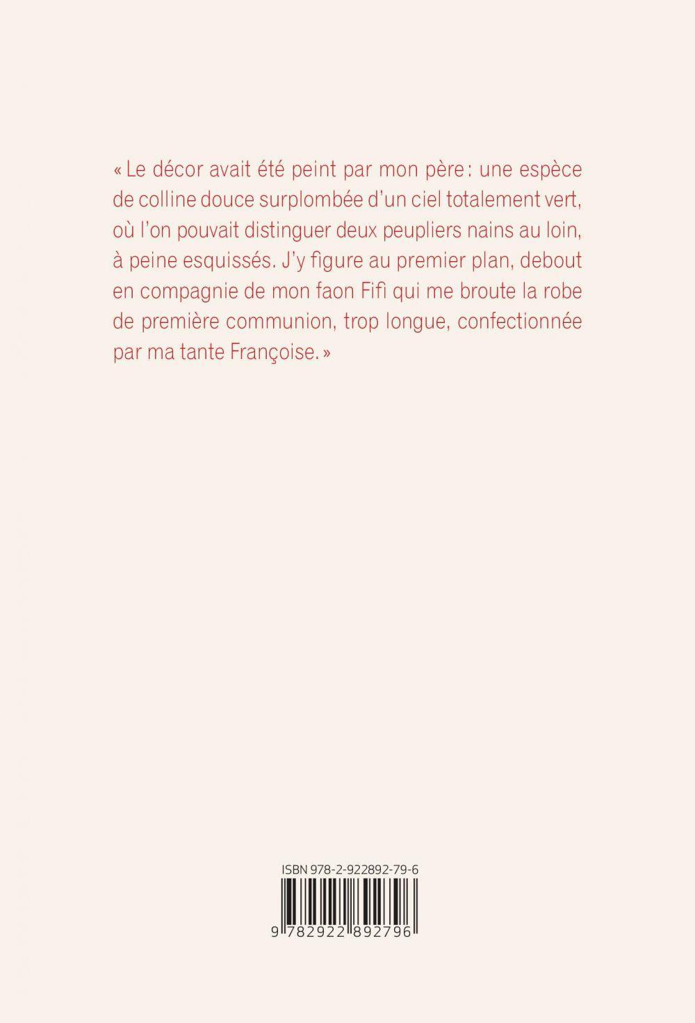 «Le décor avait été peint par mon père: une espèce de colline douce surplombée d'un ciel totalement vert, où l'on pouvait distinguer deux peupliers nains au loin, à peine esquissés. J'y figure au premier plan, debout en compagnie de mon faon Fifi qui me broute la robe de première communion, trop longue, confectionnée par ma tante Françoise.»