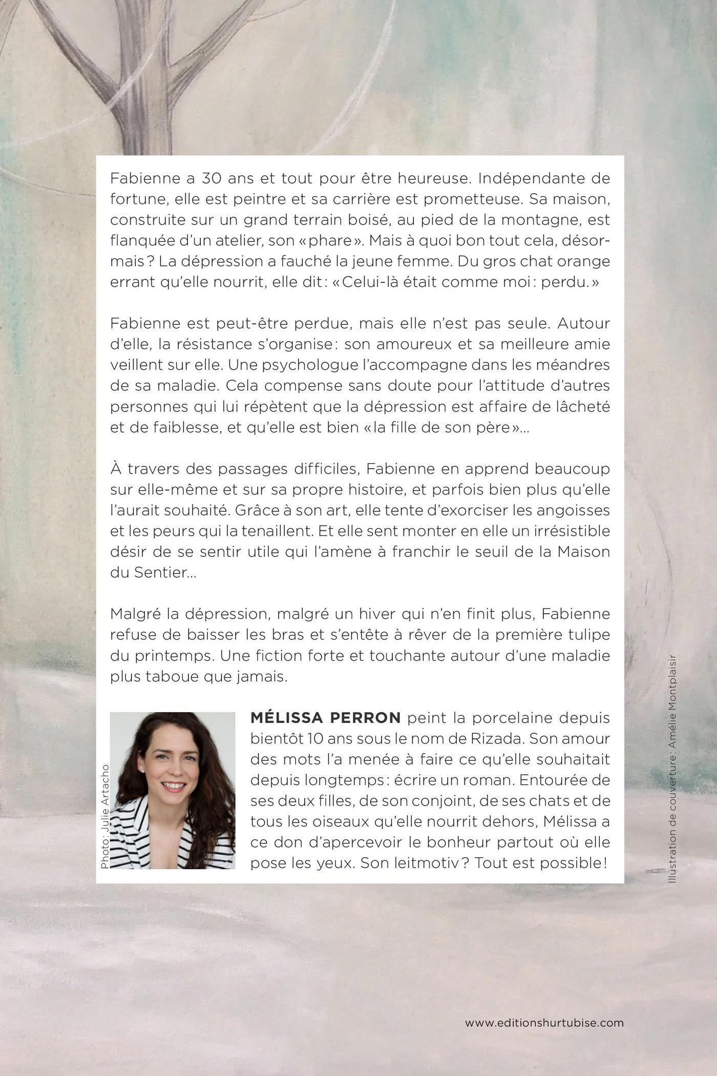 Fabienne a 30 ans et tout pour être heureuse. Indépendante de fortune, elle est peintre et sa carrière est prometteuse. Sa maison, construite sur un grand terrain boisé, au pied de la montagne, est flanquée d’un atelier, son «phare». Mais à quoi bon tout cela, désormais? La dépression a fauché la jeune femme. Du gros chat orange errant qu’elle nourrit, elle dit : «Celui-là était comme moi : perdu.»Fabienne est peut-être perdue, mais elle n’est pas seule. Autour d’elle, la résistance s’organise: son amoureux et sa meilleure amie veillent sur elle. Une psychologue l’accompagne dans les méandres de sa maladie. Cela compense sans doute pour l’attitude d’autres personnes qui lui répètent que la dépression est affaire de lâcheté et de faiblesse, et qu’elle est bien «la fille de son père»…À travers des passages difficiles, Fabienne en apprend beaucoup sur elle-même et sur sa propre histoire, et parfois bien plus qu’elle l’aurait souhaité. Grâce à son art, elle tente d’exorciser les angoisses et les peurs qui la tenaillent. Et elle sent monter en elle un irrésistible désir de se sentir utile qui l’amène à franchir le seuil de la Maison du Sentier…Malgré la dépression, malgré un hiver qui n’en finit plus, Fabienne refuse de baisser les bras et s’entête à rêver de la première tulipe du printemps. Une fiction forte et touchante autour d’une maladie plus taboue que jamais.