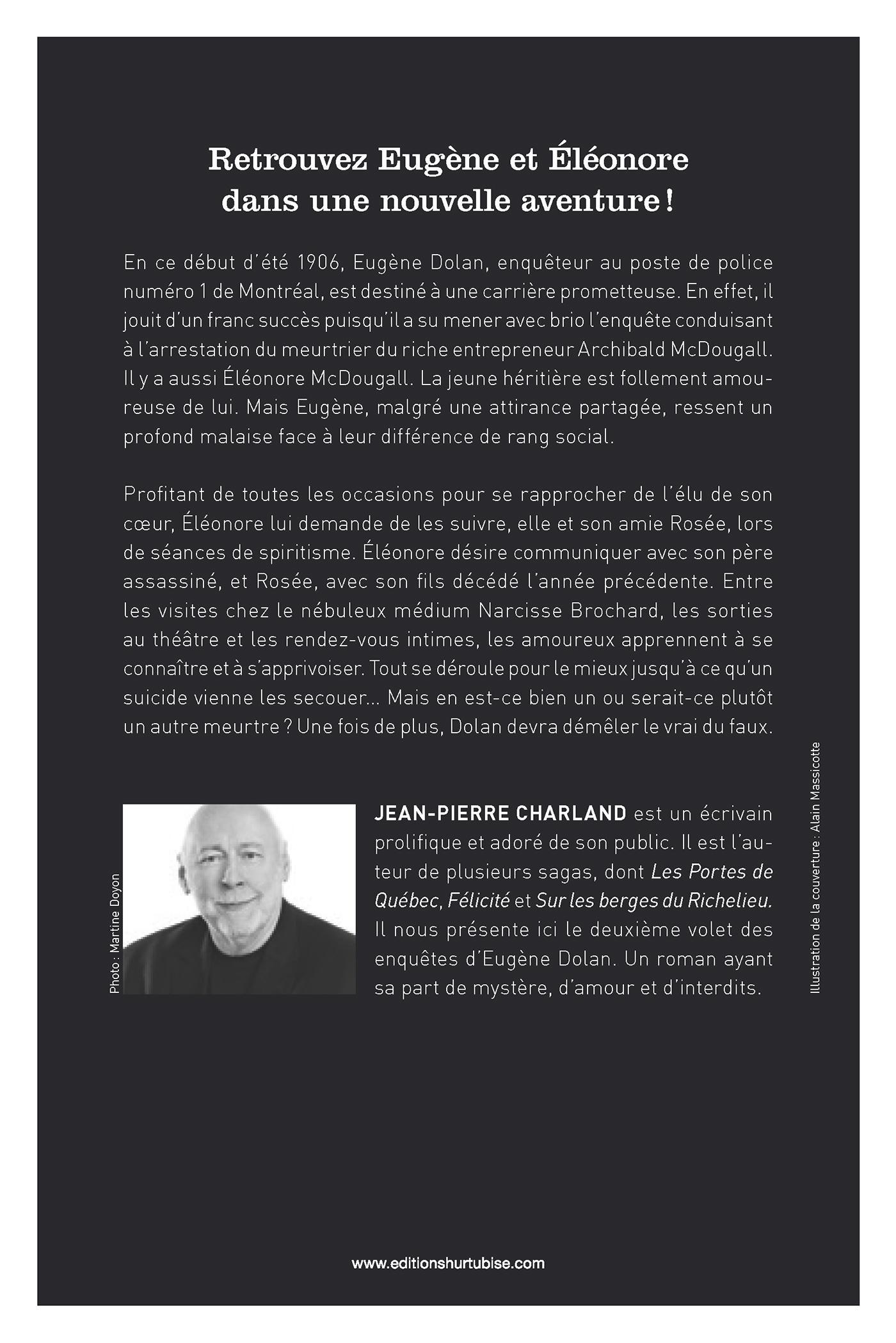 En ce début d’été 1906, Eugène Dolan, enquêteur au poste de police numéro 1 de Montréal, est destiné à une carrière prometteuse. En effet, il jouit d’un franc succès puisqu’il a su mener avec brio l’enquête conduisant à l’arrestation du meurtrier du riche entrepreneur Archibald McDougall. Il y a aussi Éléonore McDougall. La jeune héritière est follement amoureuse de lui. Mais Eugène, malgré une attirance partagée, ressent un profond malaise face à leur différence de rang social.Profitant de toutes les occasions pour se rapprocher de l’élu de son coeur, Éléonore lui demande de les suivre, elle et son amie Rosée, lors de séances de spiritisme. Éléonore désire communiquer avec son père assassiné, et Rosée, avec son fils décédé l’année précédente. Entre les visites chez le nébuleux médium Narcisse Brochard, les sorties au théâtre et les rendez-vous intimes, les amoureux apprennent à se connaître et à s’apprivoiser. Tout se déroule pour le mieux jusqu’à ce qu’un suicide vienne les secouer… Mais en est-ce bien un ou serait-ce plutôt un autre meurtre? Une fois de plus, Dolan devra démêler le vrai du faux.