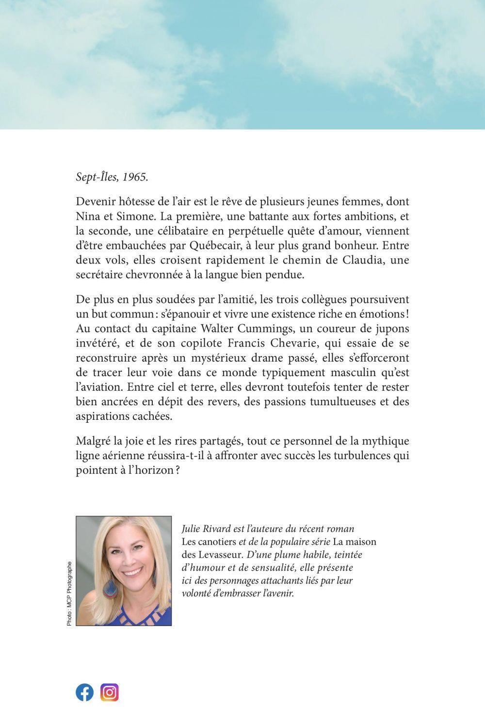 Sept-Îles, 1965. Devenir hôtesse de l’air est le rêve de plusieurs jeunes femmes, dont Nina et Simone. La première, une battante aux fortes ambitions, et la seconde, une célibataire en perpétuelle quête d’amour, viennent d’être embauchées par Québecair, à leur plus grand bonheur. Entre deux vols, elles croisent rapidement le chemin de Claudia, une secrétaire chevronnée à la langue bien pendue. De plus en plus soudées par l’amitié, les trois collègues poursuivent un but commun: s’épanouir et vivre une existence riche en émotions! Au contact du capitaine Walter Cummings, un coureur de jupons invétéré, et de son copilote Francis Chevarie, qui essaie de se reconstruire après un mystérieux drame passé, elles s’efforceront de tracer leur voie dans ce monde typiquement masculin qu’est l’aviation. Entre ciel et terre, elles devront toutefois tenter de rester bien ancrées en dépit des revers, des passions tumultueuses et des aspirations cachées. Malgré la joie et les rires partagés, tout ce personnel de la mythique ligne aérienne réussira-t-il à affronter avec succès les turbulences qui pointent à l’horizon?Julie Rivard est l’auteure du récent roman Les canotiers et de la populaire série La maison des Levasseur. D’une plume habile, teintée d’humour et de sensualité, elle présente ici des personnages attachants liés par leur volonté d’embrasser l’avenir.