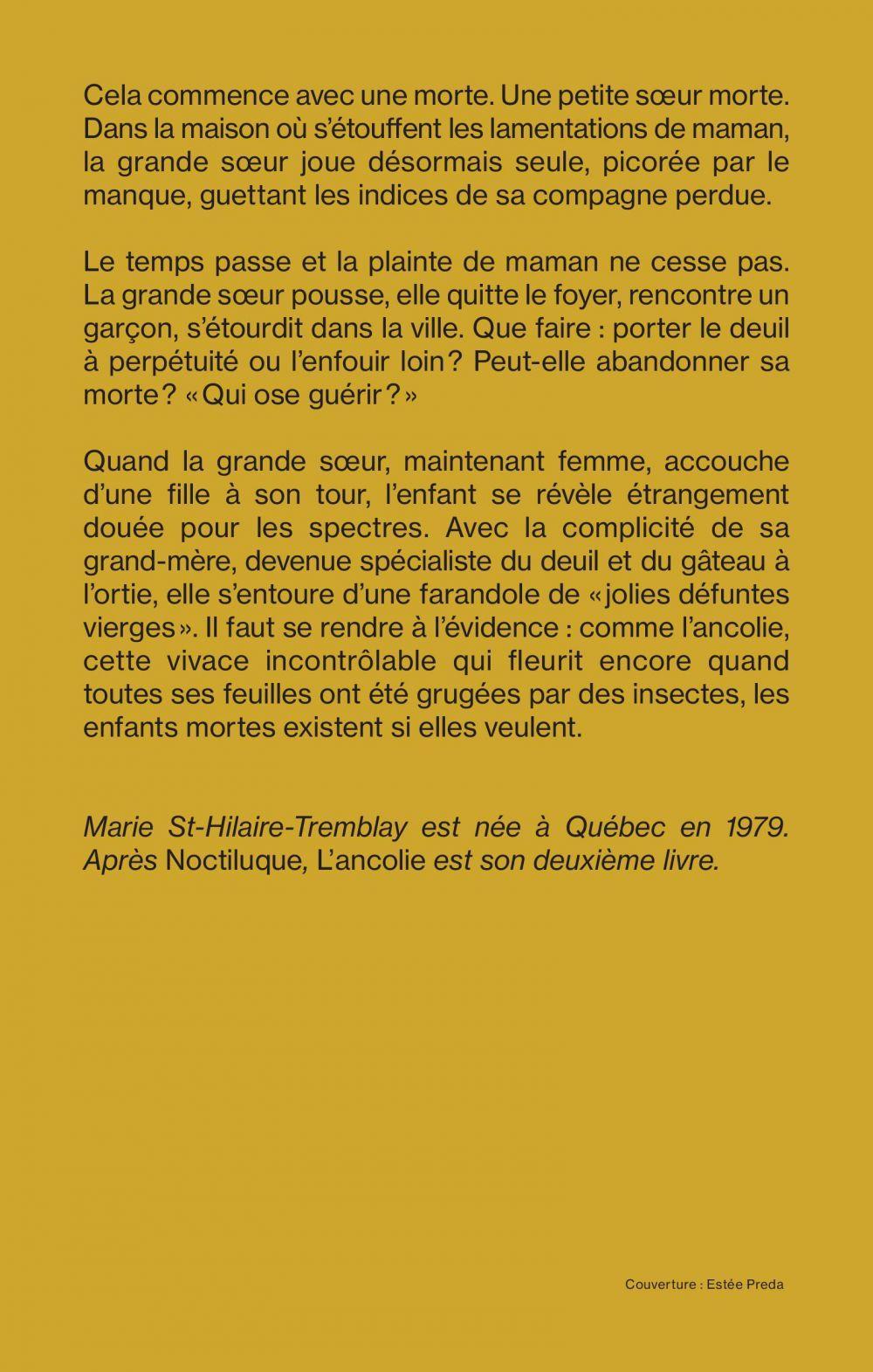 Cela commence avec une morte. Une petite sœur morte. Dans la maison où s’étouffent les lamentations de maman, la grande sœur joue désormais seule, picorée par le manque, guettant les indices de sa compagne perdue.Le temps passe et la plainte de maman ne cesse pas. La grande sœur pousse, elle quitte le foyer, rencontre un garçon, s’étourdit dans la ville. Que faire : porter le deuil à perpétuité ou l’enfouir loin ? Peut-elle abandonner sa morte ? « Qui ose guérir ? »Quand la grande sœur, devenue femme, accouche d’une fille à son tour, l’enfant se révèle étrangement douée pour les spectres. Avec la complicité de sa grand-mère, devenue spécialiste du deuil et du gâteau à l’ortie, elle s’entoure d’une farandole de « jolies défuntes vierges ». Il faut se rendre à l’évidence : comme l’ancolie, cette vivace incontrôlable qui fleurit encore quand toutes ses feuilles ont été grugées par des insectes, les enfants mortes existent si elles veulent.