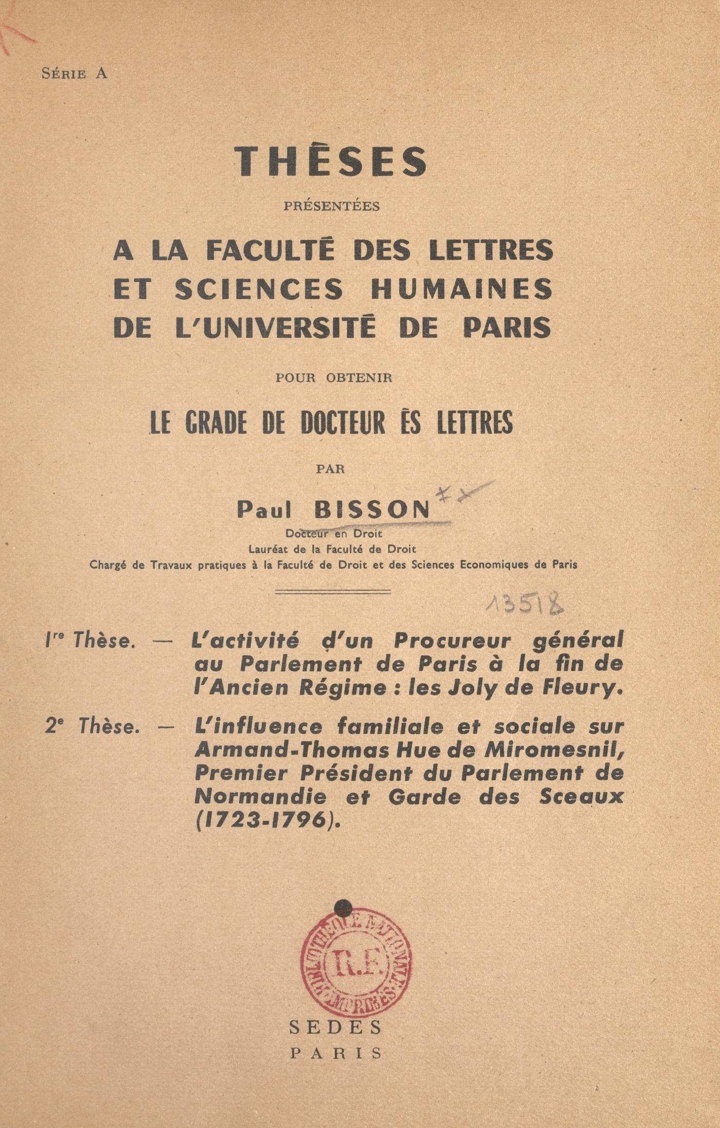 L'activité d'un procureur général au Parlement de Paris à la fin de l'Ancien Régime, les Joly de Fleury