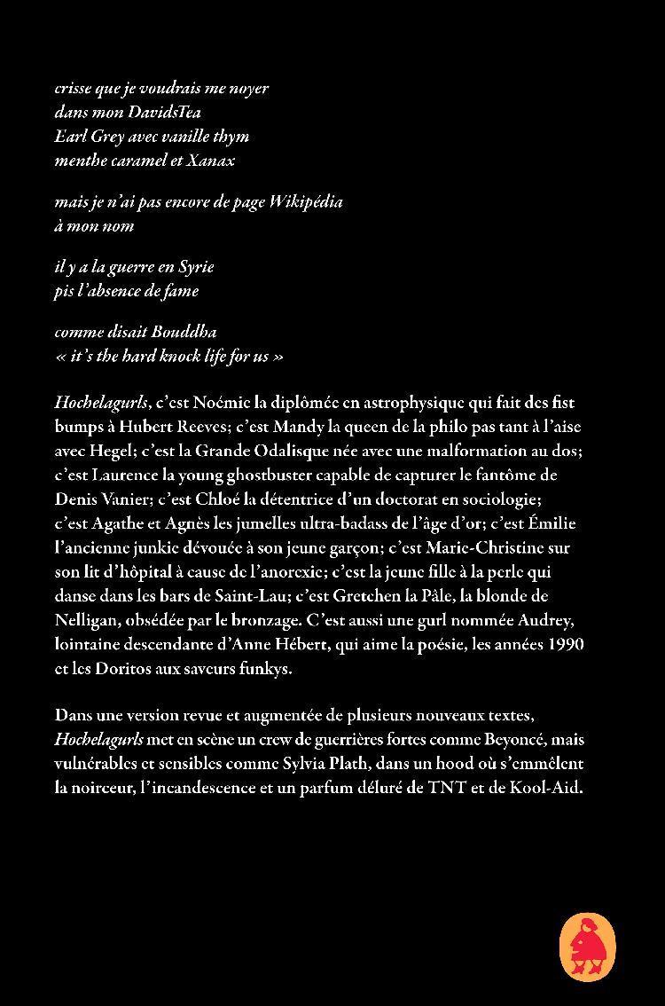 Hochelagurls, c’est Noémie la diplômée en astrophysique qui fait des fist bumps à Hubert Reeves; c’est Mandy la queen de la philo pas tant à l’aise avec Hegel; c’est la Grande Odalisque née avec une malformation au dos; c’est Laurence la young ghostbuster capable de capturer le fantôme de Denis Vanier; c’est Chloé la détentrice d’un doctorat en sociologie; c’est Agathe et Agnès les jumelles ultra-badass de l’âge d’or; c’est Émilie l’ancienne junkie dévouée à son jeune garçon; c’est Marie Christine sur son lit d’hôpital à cause de l’anorexie; c’est la jeune fille à la perle qui danse dans les bars de Saint-Lau; c’est Gretchen la Pâle, la blonde de Nelligan, obsédée par le bronzage. C’est aussi une gurl nommée Audrey, lointaine descendante d’Anne Hébert, qui aime la poésie, les années 1990 et les Doritos aux saveurs funkys.Dans une version revue et augmentée de plusieurs nouveaux textes, Hochelagurls met en scène un crew de guerrières fortes comme Beyoncé, mais vulnérables et sensibles comme Sylvia Plath, dans un hood où s’emmêlent la noirceur, l’incandescence et un parfum déluré de TNT et de Kool-Aid.