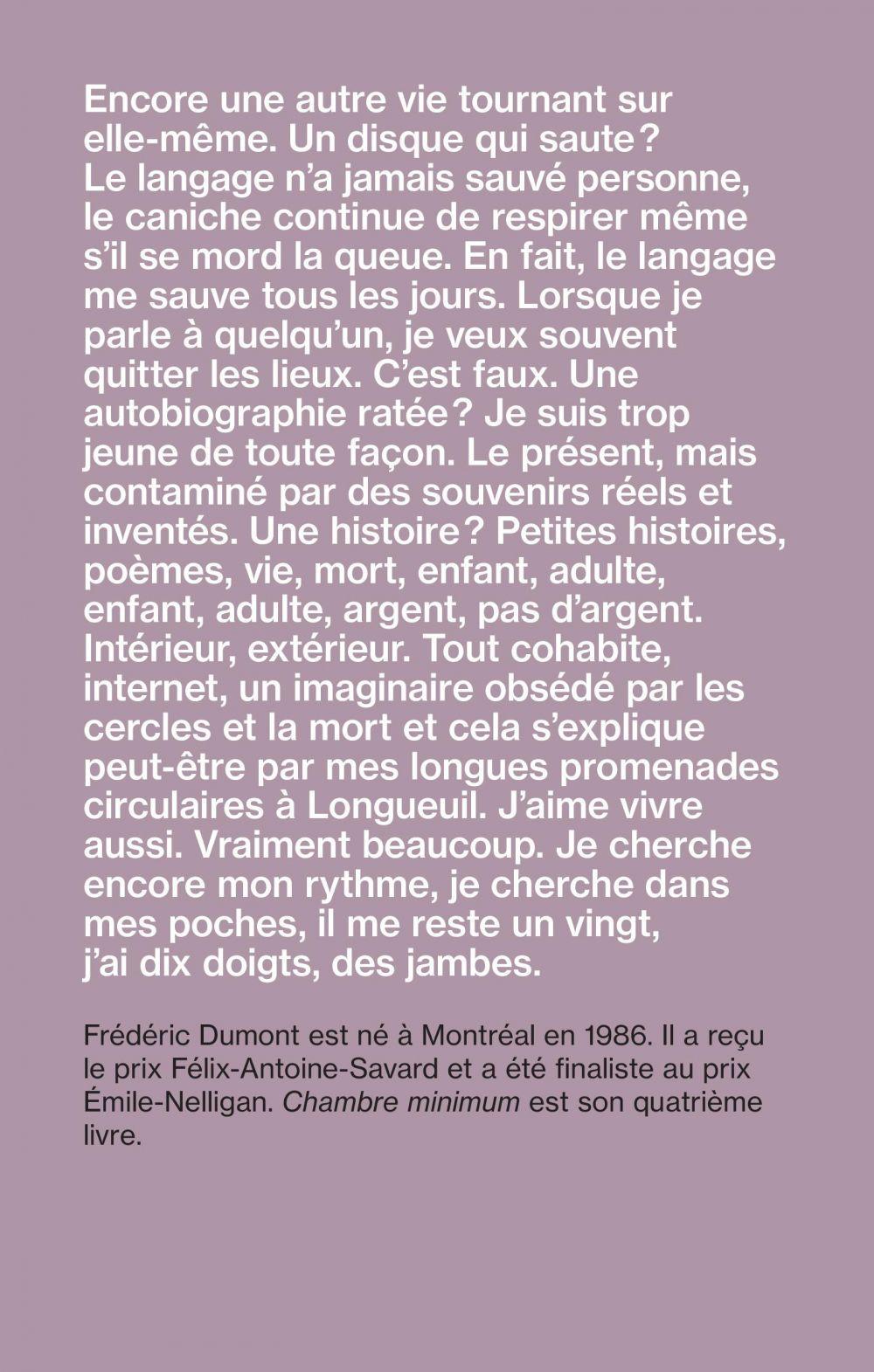 Encore une autre vie tournant sur elle même. Un disque qui saute? Le langage n’a jamais sauvé personne, le caniche continue de respirer même s’il se mord la queue. En fait, le langage me sauve tous les jours. Lorsque je parle à quelqu’un, je veux souvent quitter les lieux. C’est faux. Une autobiographie ratée? Je suis trop jeune de toute façon. Le présent, mais contaminé par des souvenirs réels et inventés. Une histoire? Petites histoires, poèmes, vie, mort, enfant, adulte, enfant, adulte, argent, pas d’argent. Intérieur, extérieur. Tout cohabite, internet, un imaginaire obsédé par les cercles et la mort et cela s’explique peut-être par mes longues promenades circulaires à Longueuil. J’aime vivre aussi. Vraiment beaucoup. Je cherche encore mon rythme, je cherche dans mes poches, il me reste un vingt, j’ai dix doigts, des jambes.