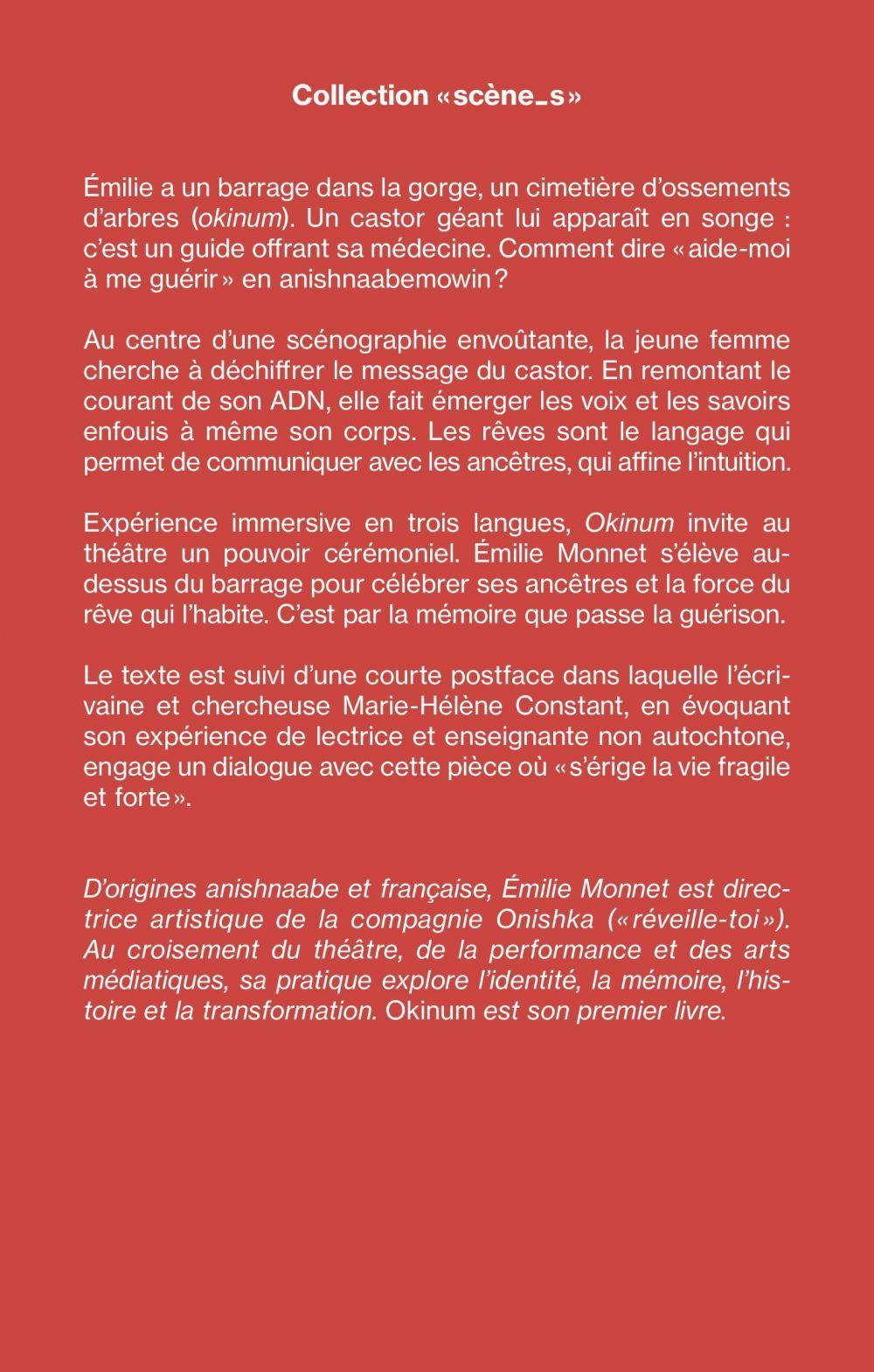 Émilie a un barrage dans la gorge, un cimetière d’ossements d’arbres (okinum). Un castor géant lui apparaît en songe : c’est un guide offrant sa médecine. Comment dire « aide-moi à me guérir » en anishnaabemowin?Au centre d’une scénographie envoûtante, la jeune femme cherche à déchiffrer le message du castor. En remontant le courant de son ADN, elle fait émerger les voix et les savoirs enfouis à même son corps. Les rêves sont le langage qui permet de communiquer avec les ancêtres, qui affine l’intuition.Expérience immersive en trois langues, Okinum invite au théâtre un pouvoir cérémoniel. Émilie Monnet s’élève au-dessus du barrage pour célébrer ses ancêtres et la force du rêve qui l’habite. C’est par la mémoire que passe la guérison.Le texte est suivi d’une courte postface dans laquelle l’écrivaine et chercheuse Marie-Hélène Constant, en évoquant son expérience comme lectrice et enseignante non autochtone, engage un dialogue avec cette pièce où « s’érige la vie fragile et forte ».