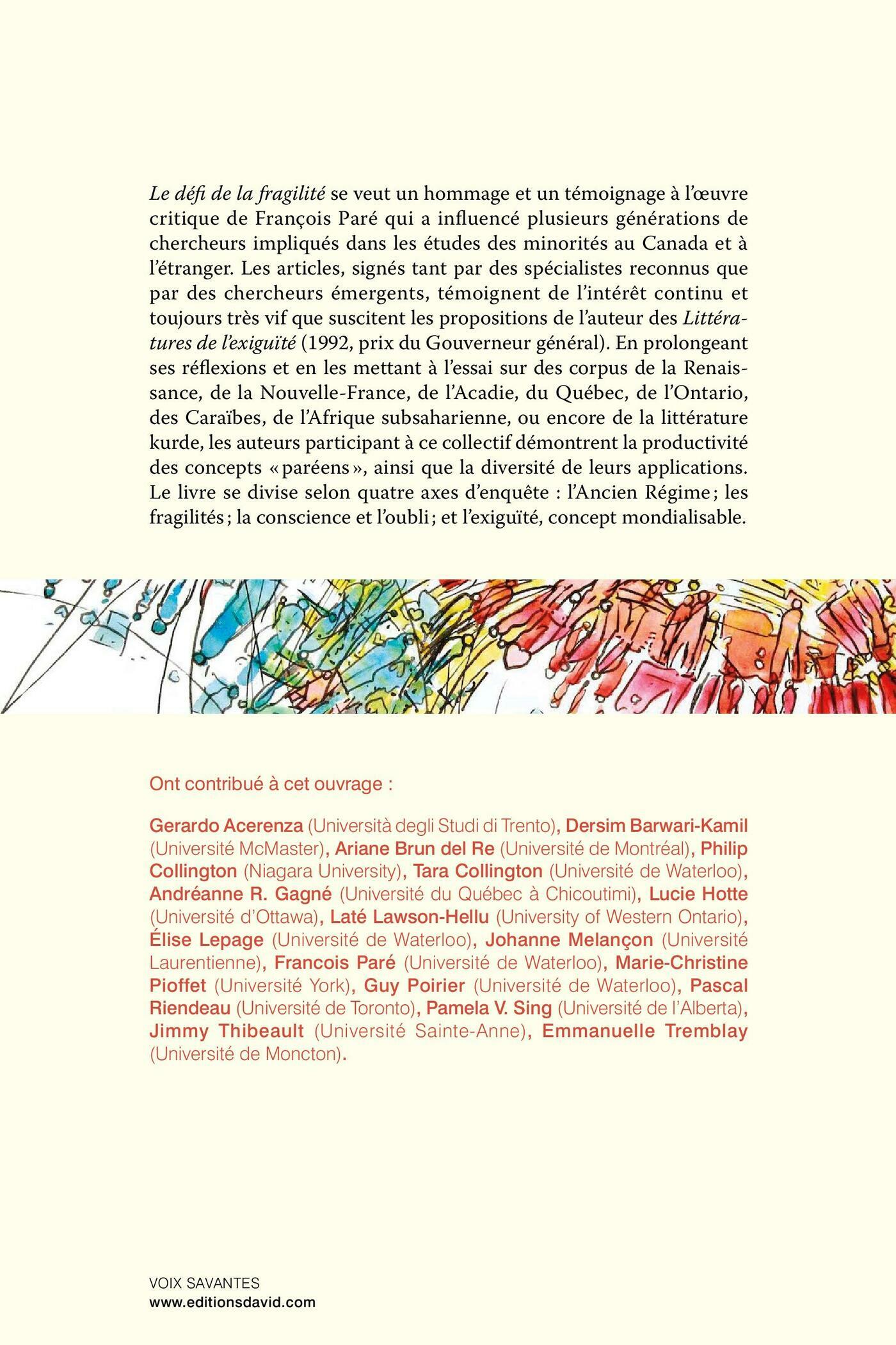 Le défi de la fragilité se veut un hommage et un témoignage à l’œuvre critique de François Paré qui a influencé plusieurs générations de chercheurs impliqués dans les études des minorités au Canada et à l’étranger. Les articles, signés tant par des spécialistes reconnus que par des chercheurs émergents, témoignent de l’intérêt continu et toujours très vif que suscitent les propositions de l’auteur des Littératures de l’exiguïté (1992, prix du Gouverneur général). En prolongeant ses réflexions et en les mettant à l’essai sur des corpus de la Renaissance, de la Nouvelle-France, de l’Acadie, du Québec, de l’Ontario, des Caraïbes, de l’Afrique subsaharienne, ou encore de la littérature kurde, les auteurs participant à ce collectif démontrent la productivité des concepts « paréens », ainsi que la diversité de leurs applications. Le livre se divise selon quatre axes d’enquête : l’Ancien Régime; les fragilités; la conscience et l’oubli; et l’exiguïté, concept mondialisable.Ont contribué à cet ouvrage : Gerardo Acerenza (Università degli Studi di Trento), Dersim Barwari-Kamil (Université McMaster), Ariane Brun del Re (Université de Montréal), Philip Collington (Niagara University), Tara Collington (Université de Waterloo), Andréanne R. Gagné (Université du Québec à Chicoutimi), Lucie Hotte (Université d’Ottawa), Laté Lawson-Hellu (University of Western Ontario), Élise Lepage (Université de Waterloo), Johanne Melançon (Université Laurentienne), Francois Paré (Université de Waterloo), Marie-Christine Pioffet (Université York), Guy Poirier (Université de Waterloo), Pascal Riendeau (Université de Toronto), Pamela V. Sing (Université de l’Alberta), Jimmy Thibeault (Université Sainte-Anne), Emmanuelle Tremblay (Université de Moncton).