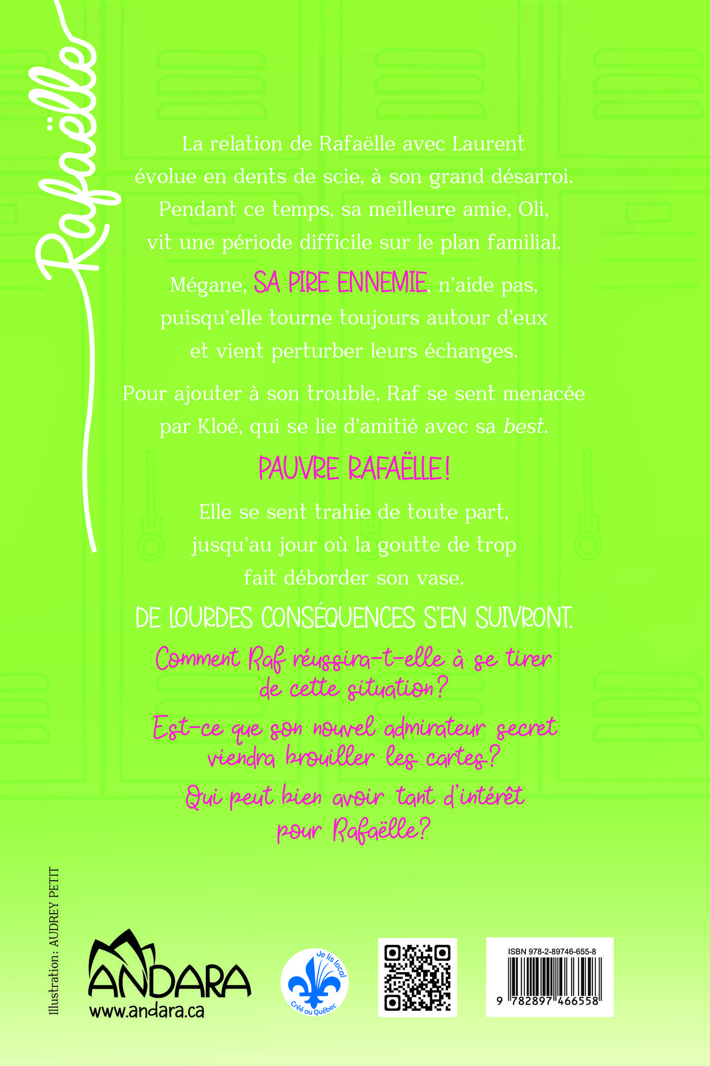 La relation de Rafaëlle avec Laurent évolue en dents de scie, à son grand désarroi. Pendant ce temps, sa meilleure amie, Oli, vit une période difficile sur le plan familial. Mégane, SA PIRE ENNEMIE, n’aide pas, puisqu’elle tourne toujours autour d’eux et vient perturber leurs échanges. Pour ajouter à son trouble, Raf se sent menacée par Kloé, qui se lie d’amitié avec sa best. PAUVRE RAFAËLLE ! Elle se sent trahie de toute part, jusqu’au jour où la goutte de trop fait déborder son vase. DE LOURDES CONSÉQUENCES S’EN SUIVRONT. Comment Raf réussira-t-elle à se tirer de cette situation ? Est-ce que son nouvel admirateur secret viendra brouiller les cartes ?