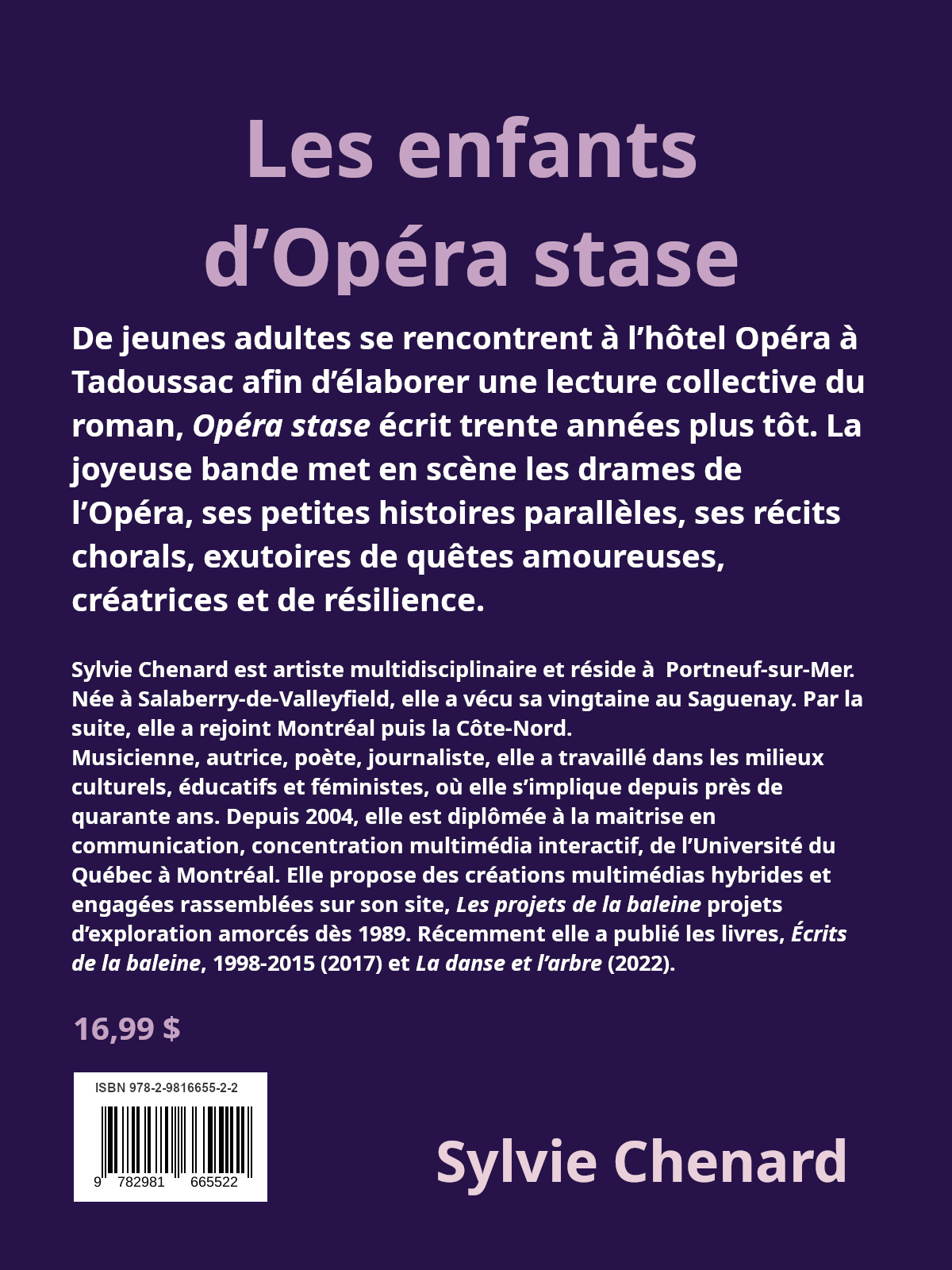De jeunes adultes se rencontrent à l’hôtel Opéra à Tadoussac afin d’élaborer une lecture collective du roman, Opéra stase écrit trente années plus tôt. La joyeuse bande met en scène les drames de l’Opéra, ses petites histoires parallèles, ses récits chorals, exutoires de quêtes amoureuses, créatrices et de résilience.