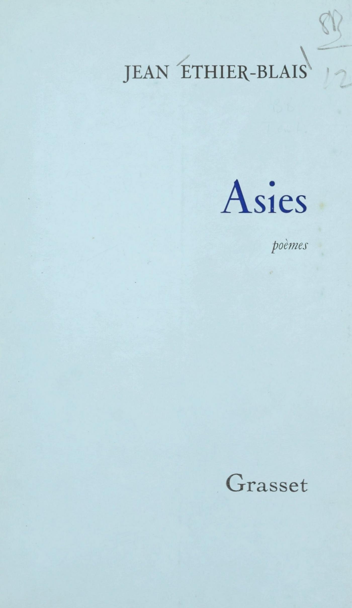 Pour le critique, l’esthète, pour celui que la beauté conduit à se poser des questions essentielles qui touchent à l’art et à sa réussite, pas de doute : Asies est au cœur de ce qui le contraint. Il y a là une façon d’utiliser le vocabulaire le plus simple, celui de tous les jours et de nos jours, une manière de le distribuer dans le vers, comme sans appeler les mots, sans les solliciter, qui font notre étonnement et notre plaisir sans mélange. Que dire, enfin, des sentiments ? Ceux-là mêmes que vous éprouvez, fussiez-vous de la ville ou de la campagne et porté vers la nuit ou le jour. Là-dessus, ou là-dedans, une sensibilité aiguë au rythme, à la vie la plus nerveuse ou la plus alanguie — mais non la moins vraie — du langage. Par le biais de ce premier recueil, Jean Ethier-Blais s’impose, sans forcer, comme un grand poète, qui donne à rêver des soirées à la clarté de la lampe, quand enfin on sait que les mots vont exprimer — presque — la totalité du monde.
