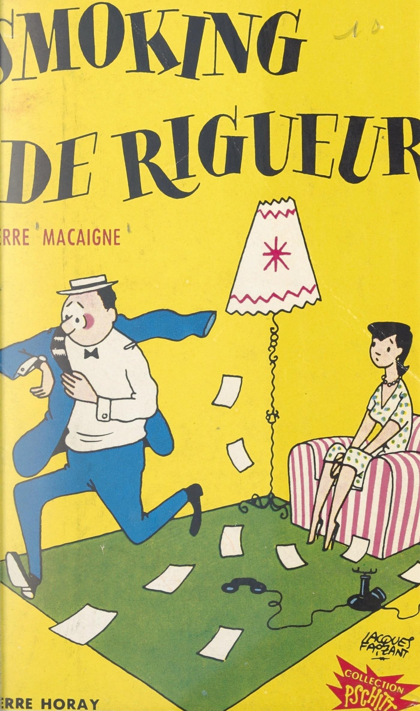 En 1944, heureux passage à MINERVE, Max Favalelli y étant consul. Puis à RESISTANCE et à La DEPECHE de PARIS avec Yvan Audouard. Appartient depuis 10 ans à la rédaction du FIGARO et à celle du FIGARO-LITTERAIRE où, sous le pseudonyme de CHERUBIN, il tend désespérément l’oreille aux échos toutes les semaines. Fait de la Radio, de temps en temps, pour s’entretenir la voix. Les voyages formant la jeunesse, il fut envoyé en reportage aux quatre coins du monde. N’a pourtant pas remonté l’Amazone. Sport favori : la gastronomie qu’il pratique sur tous les terrains et sous toutes les latitudes. Membre de l’Association des Grands Reporters, a obtenu en 1955 le Prix de la Chronique Parisienne pour ses courageuses explorations aux sources de la vie mondaine, dans les savanes et les hautes herbes des beaux quartiers. Dans SMOKING DE RIGUEUR, Pierre Macaigne, avec un humour d’une grande finesse, met en scène un personnage qu’il connaît bien : le chroniqueur parisien. Ce soiriste et sa femme qui passent leur temps à se chercher, l’un travaillant le jour, l’autre la nuit, nous entraînent avec eux dans une suite d’aventures cocasses, absurdes, charmantes et sentimentales. Mais SMOKING DE RIGUEUR n’est pas seulement un livre drôle, le roman désopilant d’un ménage d’aujourd’hui. Ce n’est pas une satire ni même un pamphlet. C’est aussi l’étonnant tableau d’une manière de vie moderne, un roman gai où les personnages sont autant de petits portraits caricaturés d’un crayon pointu.