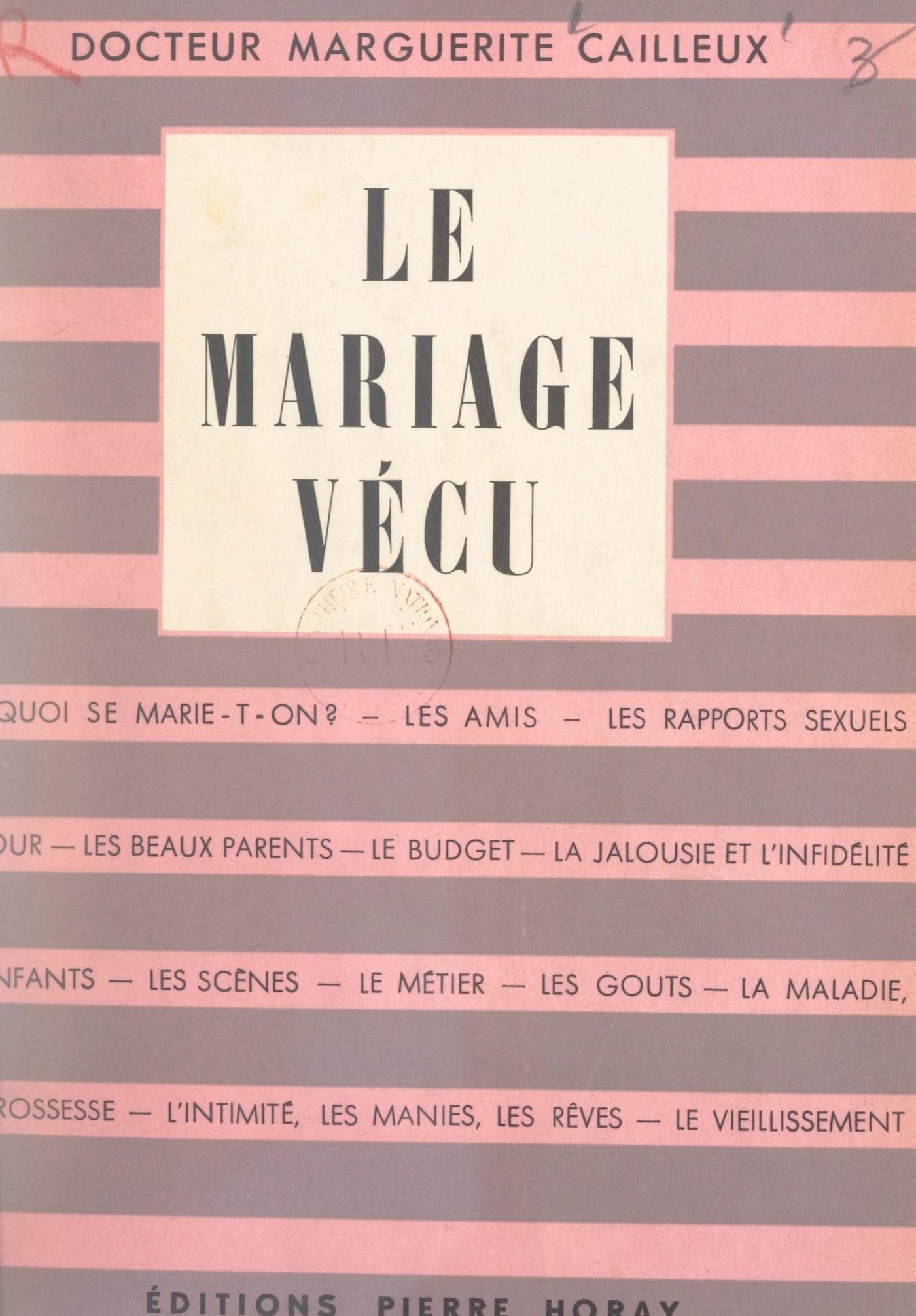 Marcel Aymé a tout dit sur le « Prière d’Insérer ». Mais il n’a pas prévu le cas d’un écrivain qui doit le rédiger à propos de l’ouvrage de sa propre femme, surtout quand celle-ci traite d’un cas auquel il est aussi directement intéresse. Dirai-je que LE MARIAGE VÉCU m’a appris beaucoup de choses ? Oui, car je me demandais depuis pas mal d’années ce que ma femme pensait de ce piquant problème qui me passionne aussi, je dois l’avouer. A ma grande surprise, j’ai découvert, après chaque chapitre où elle s’exprimait, une « opinion du mari » qui m’a laissé rêveur. Je ne lui connaissais jusqu’alors pas d’autre mari que moi-même, et ce personnage abstrait m’intriguait. J’avais peur qu’il ne soit psychanalyste lui aussi. C’eut été beaucoup pour un seul ménage. Mais non, ce mari me plaît assez. Un peu paradoxal, libre de préjugés, ayant lu un peu trop (à mon goût), mais semblant avoir digéré ses lectures, bien que maniaque de la citation, indulgent (sauf envers SARTRE), imprévu, assez drôle, bref : un double que j’aimerais rencontrer. Désirerais-je lui ressembler ? Je partage souvent son avis, mais je suis loin, comme disait l’autre, d’abonder toujours dans mon sens. L’opinion de la femme a plus profondément retenu mon attention. Elle est médecin et a fait une psychanalyse didactique. Heureusement elle n’exerce pas la psychanalyse, et elle n’est pas didactique. Ce double écueil est évité (et pour les lecteurs et pour le mari). Elle ne manque pas de bon sens, de sérieux, ni d’humour. Elle sait parler divers langages. Elle aborde à peu près tous les problèmes qui intéressent les gens mariés. Sauf celui du divorce et du veuvage. Pourquoi ? Elle n’a pas de prétention. Elle ne croit pas à une solution clef. Elle ne désire que faire réfléchir ses lecteurs. J’ai été le premier à la lire et vous voyez où cela m’a entraîné : à rédiger ce « Prière d’Insérer ». J’ai l’impression d’avoir été interviewé sans le savoir. Et je suis plutôt contre les interviews. Mais il ne s’agit pas ici d’un journal intime. Une femme se penche sur son mariage. Un homme en profite pour regarder aussi. Soyons discrets...