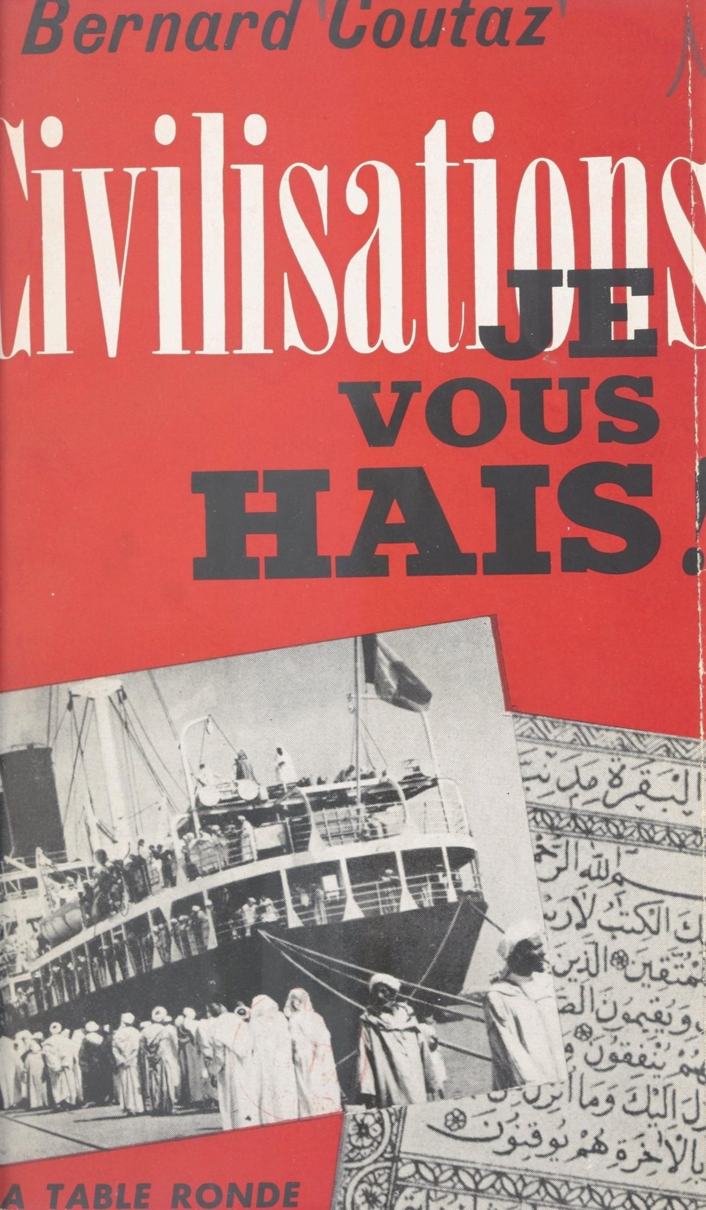 L’an dernier, Bernard Coutaz publiait Quand les ventres parlent, un roman vigoureux, frémissant de vie et de vérité qui faisait écrire à Daniel-Rops : « Bernard Coutaz dont le talent n’est pas sans rappeler celui de Maxence Van Der Meersch et qu’on sent vibrer tout entier à l’évocation des souffrances qu’il peint s’est donné la peine d’aller vivre au milieu des Nord-Africains, de les questionner, de les comprendre et il nous rapporte un livre bouleversant dans sa sincérité. » Le succès de ce livre a convaincu l’auteur qu’un large public était sensible à la grande misère des travailleurs nord-africains. Voici qu’aujourd’hui, dans un nouveau roman, il nous entraîne plus loin encore dans la connaissance de l’âme nord-africaine. Civilisations, je vous hais ! est le cri de désespoir d’un jeune intellectuel nord-africain. Un appel surtout auquel on ne peut demeurer insensible. Ce roman qui nous conduit des ruelles fermées de la Kasbah d’Alger aux cours secrètes de la mosquée de l’Olivier de Tunis, nous fait assister à l’éclosion d’une foi religieuse et nationaliste, à sa disparition aussi. Dans cette analyse, Bernard Coutaz unit une connaissance de l’Islam aussi sûre que celle d’un musulman à une liberté d’expression que seul un occidental pouvait se permettre. Les événements récents confèrent hélas à ce roman une singulière importance.