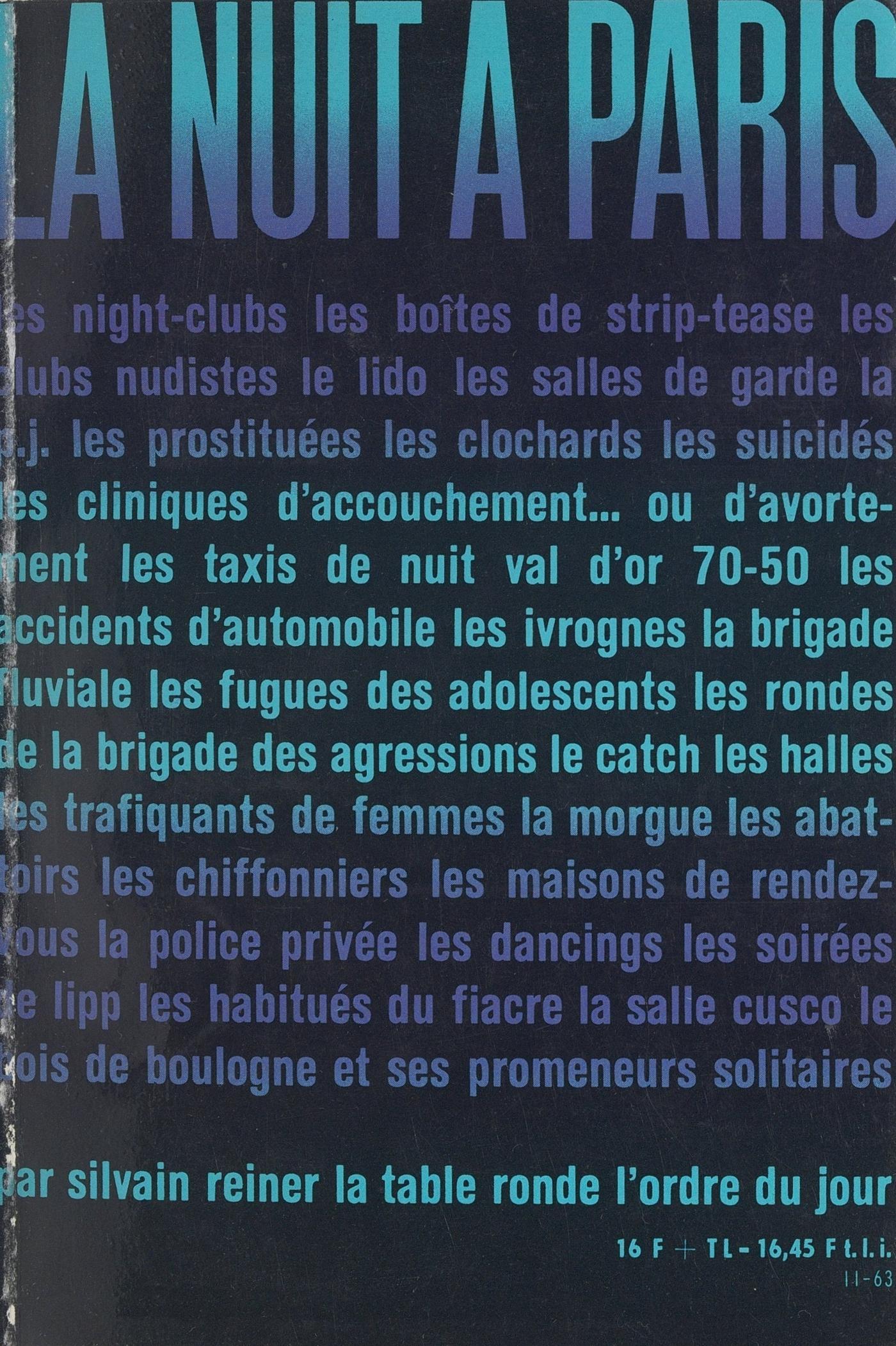 Les night-clubs, les boîtes de strip-tease, les clubs nudistes, le Lido, les salles de garde, la p.j., les prostituées, les clochards, les suicidés, les cliniques d’accouchement... ou d’avortement, les taxis de nuit, les accidents d’automobile, les ivrognes, la brigade fluviale, les fugues des adolescents, les rondes de la brigade des agressions, le catch, les halles, les trafiquants de femmes, la morgue, les abattoirs, les chiffonniers, les maisons de rendez-vous, la police privée, les dancings, les soirées de Lipp, les habitués du fiacre, la salle Cusco, le bois de Boulogne et ses promeneurs solitaires.