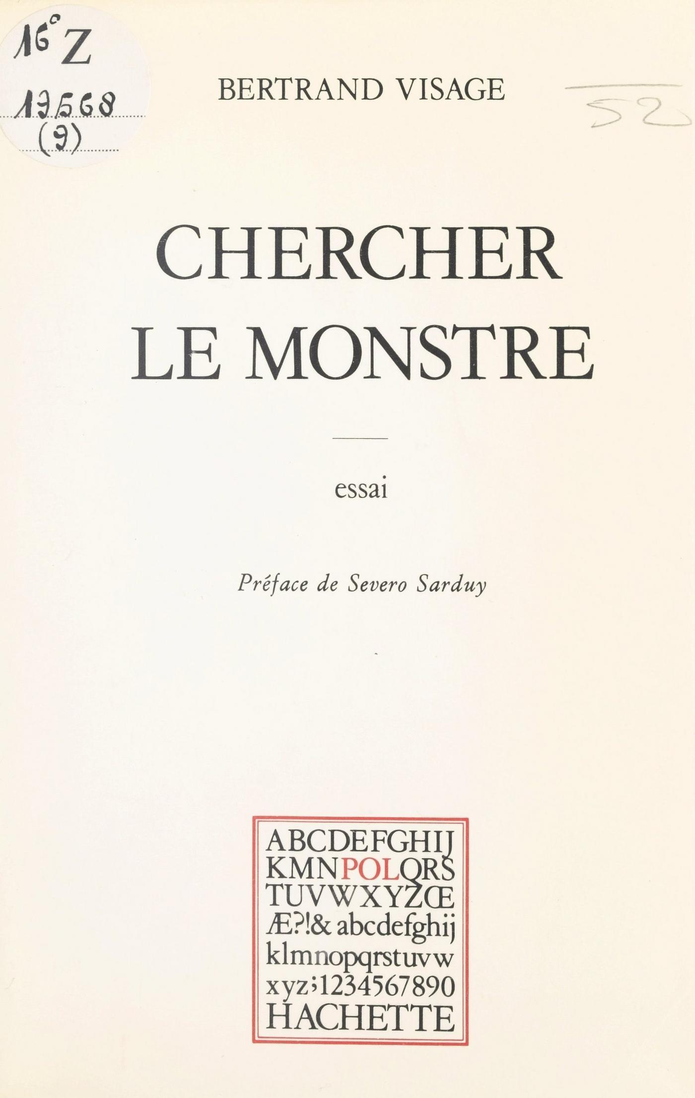 Chercher le monstre est d’abord un livre sur l’Hybridité. Cela fait qu’il n’y a pas moyen de le définir autrement que par l’énumération des matières qu’il contient : biographies de plantes (cactus, orchidées, chanvre indien), effigies d’humains bâtards - Quasimodo, Tupac Amaru, les Jumeaux du Popol-Vuh -, présentation d’un auteur insolite à nos oreilles, le polonais Bruno Schulz mort en 1942 (et sa continuation actuelle dans le théâtre de Kantor), des recettes, des chants, des peurs et des jubilations - tout ceci à opposer en bloc au constat de rétrécissement qui affecte aujourd’hui la littérature. Écrire est devenu un geste si chétif. N’englobant plus que le vécu-moignon de poupées du spectacle. Chercher le monstre est aussi l’utopie d’un certain homme-pitre (incarné ici par Tupac le dernier Inca), assez poreux, assez naïf pour risquer la crise qu’ouvre en lui la vue d’un monstre à sa ressemblance. Et moi ?... moi ?... quel hybride je suis, moi Déjà au XVIIIe, Kleist soutenait cette thèse grotesque, qu’une marionnette animée de fils possède une indiscutable suprématie plastique sur le corps vivant du danseur. Une marionnette. Un soi-même miniature, un tremblement de la génétique. qui nous oblige à déterrer des forces enfouies et ne saurait se concevoir qu’à bout de souffle.