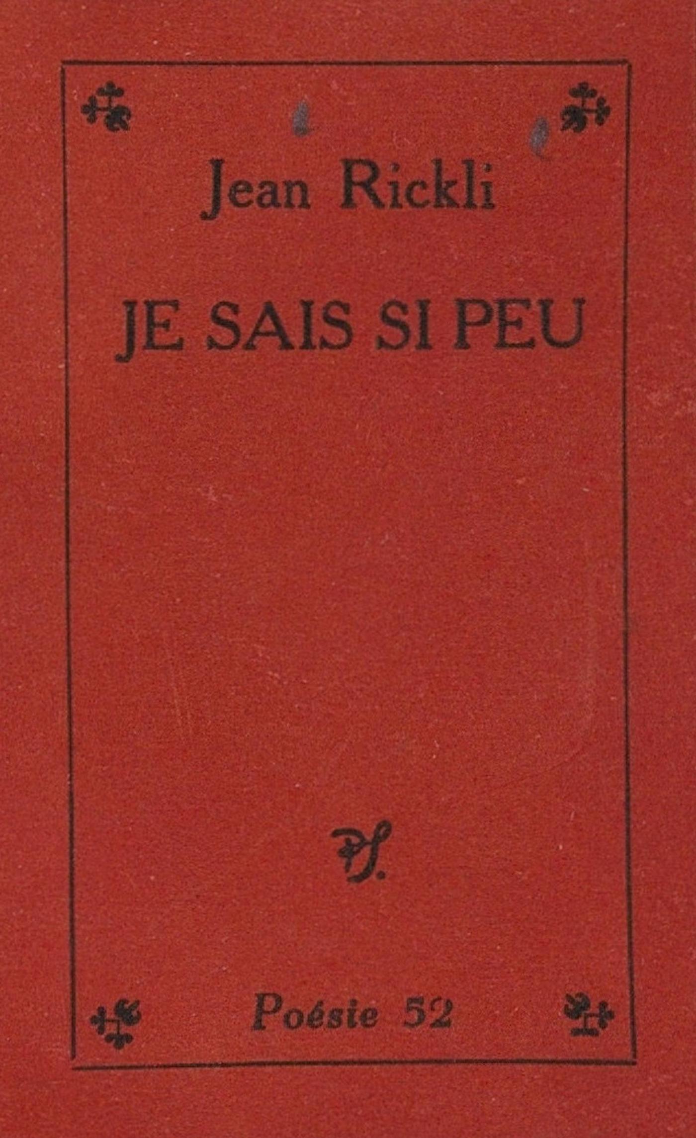 Suisse, né à Lausanne le 13 novembre 1911 dans un milieu très pauvre, Jean Rickli, l’auteur de Je sais si peu, fréquenta l’école primaire comme tout le monde. Tout gosse, il fut obligé de travailler pour apporter sa part de gain à ses parents. Il faisait cependant l’écolier, le soir, de 8 à 10 heures. Il entra très tard en apprentissage, juste avant son École de Recrues (service militaire). Puis une série noire, le chômage lui laissa beaucoup de temps pour lire, méditer et aussi rêver. Les sages, les maîtres, la grande leçon de la nature l’ont façonné. Vint la guerre immense gaspillage de temps, de forces, de tendresse et au milieu une expérience acide, dix ans où les « devoirs », comme on dit, l’ont forcé à se taire. Aujourd’hui, délivré, dans la tranquillité, il déborde. Voyant et poète, poète parce que Voyant — sa qualité de Voyant est une des clés de sa poésie — il s’occupe d’enfants difficiles et de la vie obscure des grands enfants que restent les adultes. Il travaille aussi dans son petit atelier, en artisan très attentif et très pratique, avec un certain vide autour de lui, créé par l’expérience acide. Cependant, depuis une année déjà, « protégé », selon son expression, il est merveilleusement disposé.