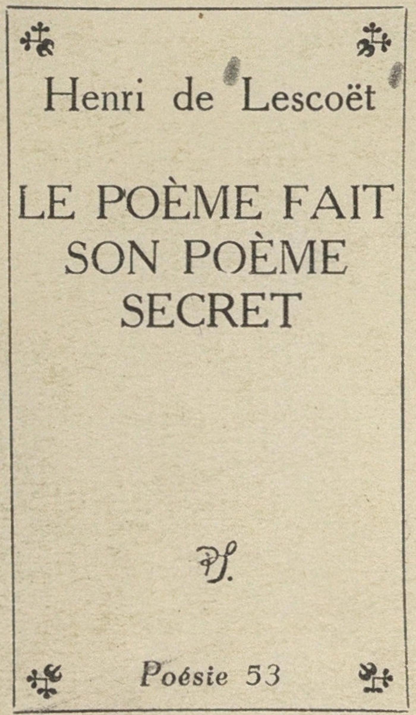 Né le 12 septembre 1907, à Anjouan (Commores). Plusieurs voyages Madagascar, les Indes, Zanzibar, l’Égypte, la Grèce, l’Italie, etc... Père gouverneur honoraire des Colonies, décédé en 1939. Henri de Lescoët, après d’assez bonnes études, se donne presque tout entier à la poésie (il s’occupe aussi de publicité), publie des poèmes, (débute dans la revue : « Les Marges », d’Eugène Montfort). Un roman suit, et un essai sur Cocteau et la poésie. C’est à ce moment-là qu’il fait sa connaissance et celle de Gide. Une grande activité. Crée des revues, dont la plus importante est : Profil Littéraire de la France, à laquelle collaborent les meilleurs écrivains. En 1941, avec Joé Bousquet, fonde le Prix Apollinaire, et, avec d’autres poètes, en 1952, le Prix Les Vacances du Poète. Collabore, entre temps, aux meilleures revues françaises et étrangères. Actuellement, achève un second roman, prépare une exposition de ses dessins. Nombreuses conférences en France, en Suisse, en Belgique... Les Prix Archon-Despérouse, de l’Académie Française, Au Service de la Pensée Française, ont couronné son œuvre. Henri de Lescoët recherche la fraternité des hommes. Il veut croire en un monde meilleur.