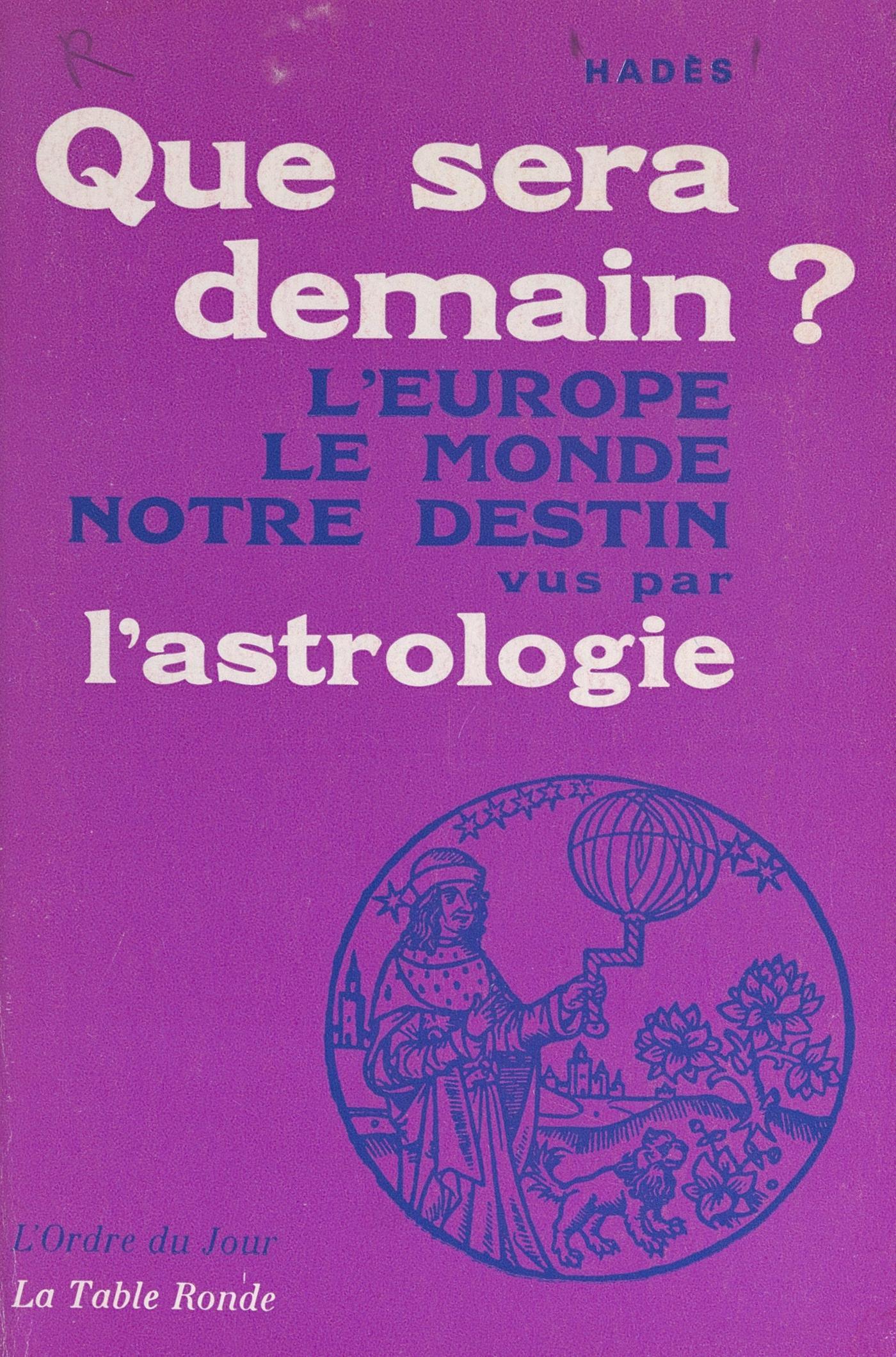 « L'Ordre du jour »Hadès, âgé de 34 ans, est l'un des astrologues européens les plus connus. Le public a pu lire ses prévisions dans l'Almanach Hachette, des journaux français et étranger, etc. Il a prévu l'assassinat de J.-F Kennedy, l'élection des deux derniers Papes, etc.Sa rencontre avec l'astrologie date de l'Extrême-Orient, où il fut correspondant de guerre à vingt ans. C'est en Orient qu’il commença l'étude des grands textes astrologiques anciens. Sait-on qu'en Chine, le Yi-King, basé sur les cycles, le fameux oracle du Livre des Mutations, eut pour client Mao Tsé-toung lui-même, qui ne déclencha la guerre de Corée qu'après consultation des astrologues chinois ?Hadès a été consulté par une foule de gens célèbres, depuis Jean Cocteau jusqu'à tel auteur de romans d'espionnage à qui il prédit sa renommée mondiale. Des femmes, des universitaires, des écrivains, des vedettes, des médecins, des chirurgiens lui ont demandé leur thème astrologique. Il ne croit pas à la voyance (qu'il assimile à un charlatanisme inconscient… ou conscient) mais à l'astrologie traditionnelle, pratiquée autrefois par Morin de Villefranche, Cardan, Kepler, Goethe, et dont on retrouve l'écho dans la vie de tous les grands de ce monde. L'astrologie, pour lui, est fondée sur des lois célestes, dont la rigueur et l'exactitude nous ont valu ce qui approche, de plus près, la perfection formelle : les mathématiques. Elle est basée sur l'heure, la date, et le lieu de naissance.Dans ce livre, écrit pour tous, à la demande de sa clientèle, Hadès étudie notre destin. D'après lui, une civilisation va mourir, une autre va naître. Mœurs, lois, vie, pays et frontières sont appelés, avant la fin du siècle, à un bouleversement total. Une ère finit et, dans cette pâle lumière crépusculaire, où s'éteignent églises et nations, où roulent pêle-mêle morales et dieux défunts, il nous reste à fixer les yeux sur une aube nouvelle. Quel est le destin de la France, de l'Europe, de la Chine, des USA, de l'URSS. ? Y aura-t-il une nouvelle guerre ? Que signifient les signes du Zodiaque ? Que veulent dire ces mots : Bélier, Taureau, Scorpion ? Quelle réalité recouvrent-ils ? À quel amour, à quelle vie, à quel avenir pouvons-nous prétendre ? Hadès répond ici à toutes ces questions et à bien d'autres.