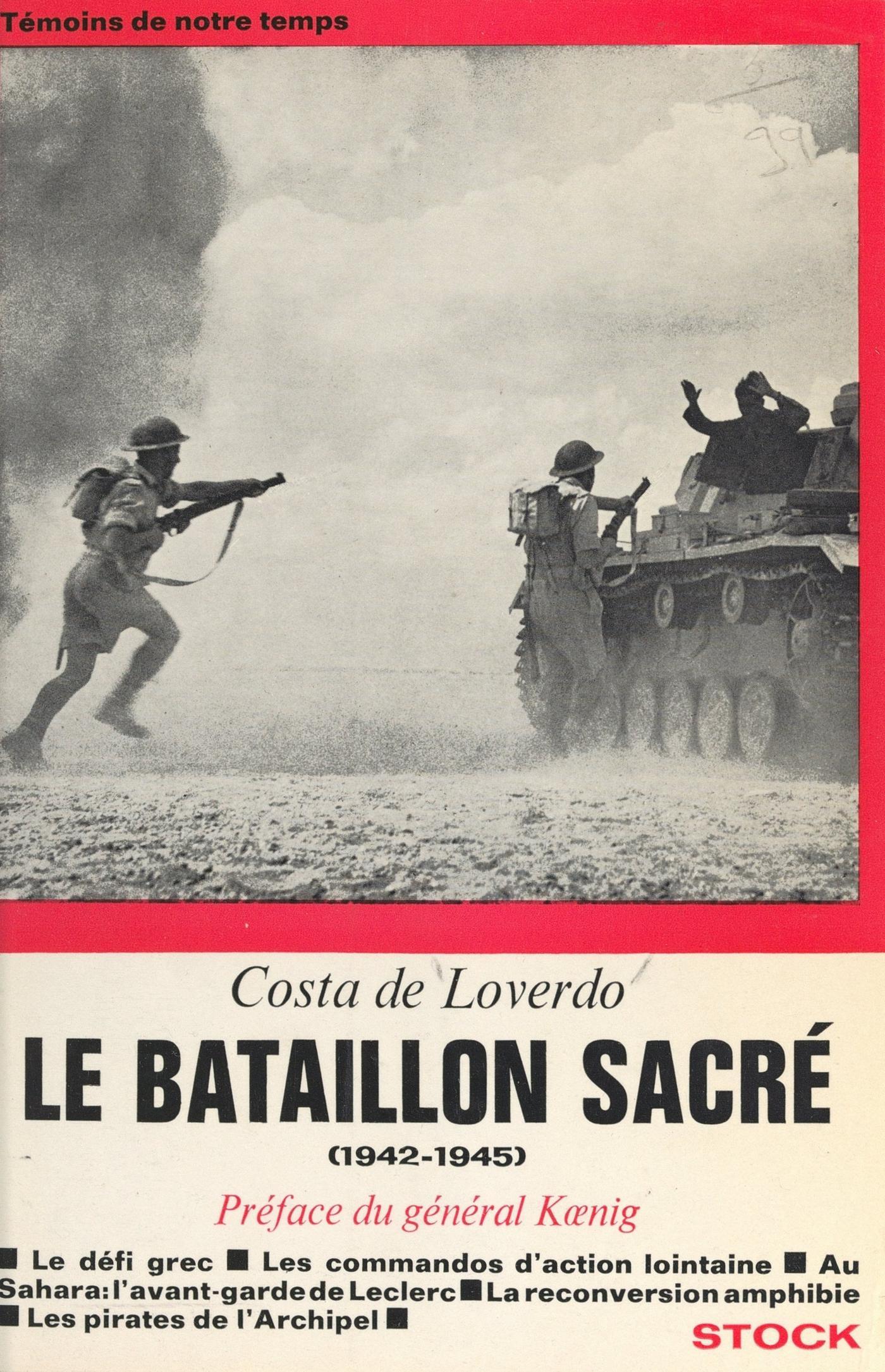 En 1942, les troupes de l’Axe ayant occupé l’Hellade, 150 officiers des Forces Grecques Libres s’enrôlent en Moyen-Orient sous les ordres du colonel Gigantès et ressuscitent le Bataillon Sacré de la Thèbes antique, avec pour devise : « Plutôt la mort que l’exil ». Après s’être soumis à l’entraînement surhumain des commandos d’action lointaine, ils se lancent en plein Sahara à la rencontre du général Leclerc. Et c’est le débordement de la ligne Mareth, les batailles légendaires de Ksar Rhilane et d’El Hamma, la prise de Gabès, l’assaut de l’oued Akharit, l’entrée à Sousse - enfin, le siège du camp retranché d’Enfidaville qui prélude à la fin des opérations en Afrique. Envahie, l’Italie capitule puis se range dans le camp allié. Les Britanniques prennent pied dans les îles de la mer grecque qui jalonnent le chemin des Dardanelles. Le Bataillon Sacré est parachuté à Samos. Mais les Nazis se fortifient à Rhodes et débarquent à Kos. Léros, isolée, succombe sous l’avalanche de leurs troupes aéroportées. Les contingents anglo-grecs évacuent et c’en est fait du « Butin de l’Egée ». Décidant alors une « guerre de pirates » contre les « hérissons » insulaires de la Wehrmacht, Churchill découple les Forces de Raid. Reconvertis en vue de la guerre amphibie, les commandos du Bataillon Sacré, dont l’effectif atteint celui d’un régiment, ravagent les chantiers navals de Samos, massacrent la Gestapo à Mitylène, coulent la flotille ennemie de Chio, s’emparent du Château des Hospitaliers à Symi, enlèvent le fort de Naxos, neutralisent les canons de Milo (Navarone) - enfin, frappant trois fois la même nuit, éventrent les défenses de Rhodes, ce qui entraîne la reddition des forces allemandes de l’Archipel. Empruntant la substance de son ouvrage aux archives inédites du grand état-major hellénique, Costa de Loverdo l’anime du souffle épique qui émane des témoignages des survivants, retraçant les exploits inouïs du dernier Bataillon Sacré de l’Histoire.