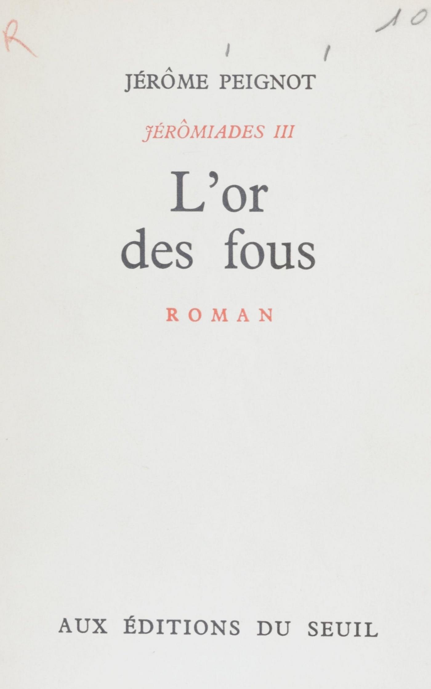 Tous les courriers du cœur, selon Jérôme Peignot, signifient : “Je ne l’aime pas. Elle (ou il) ne m’aime pas. Que faire ?” En publiant ses “Jérômiades III”, il choisit honnêtement, cruellement, de nous donner ce qui pourra paraître comme le contraire d’un “roman d’amour”. Pourquoi “L’or des fous” ? Parce que cette pyrite de fer, qui brille au soleil, fascinait les Incas. Ils la prenaient pour de l’or. Ils inventaient l’or. De même, l’amant qui regarde les larmes couler, ce malade, devient son propre médecin. Il lui semble qu’il va inventer l’ordonnance idéale : celle d’un bonheur lucide.