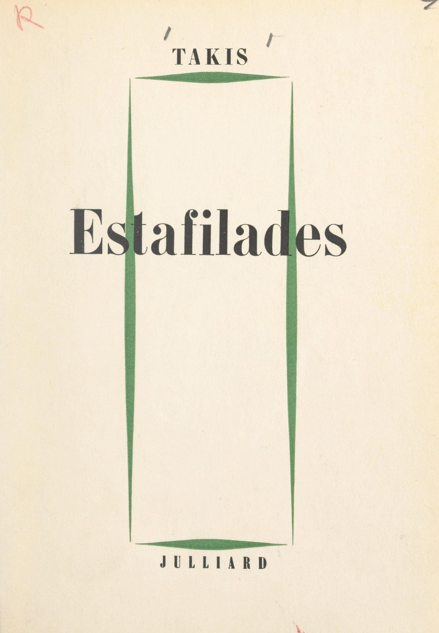 Jeune sculpteur grec de réputation internationale, Takis paraît avoir mis dans sa vie le délire inspiré qui anime son œuvre. Parler de soi avec cette sincérité sans apprêt et cet humour cruel, ce n’est pas si facile. Pas plus qu’il n’est facile, en dépit des apparences, de conquérir le public le plus averti de Paris, de Londres ou de Genève en forgeant des signaux, des fusées ou des soucoupes volantes. Mais avant d’être admis, Takis a connu en Grèce, la guerre, l’occupation, la famine. Il a été voleur, espion, portefaix. Il a été jeté en prison, s’est drogué, a fréquenté des fous, des visionnaires, des vagabonds. Jusqu’au jour où une riche Américaine lui ayant envoyé deux cents dollars, il part pour Paris, son bagage attaché par une ficelle. Commence alors une vie brillante et bousculée où les femmes, les voyages, le travail réclament en même temps leur part. Ce sont quelques images de cette vie que Takis nous livre dans ces mémoires. En plus d’un document humain d’une rare acuité psychologique, le lecteur trouvera dans ESTAFILADES une expression exemplaire du romantisme de notre temps.