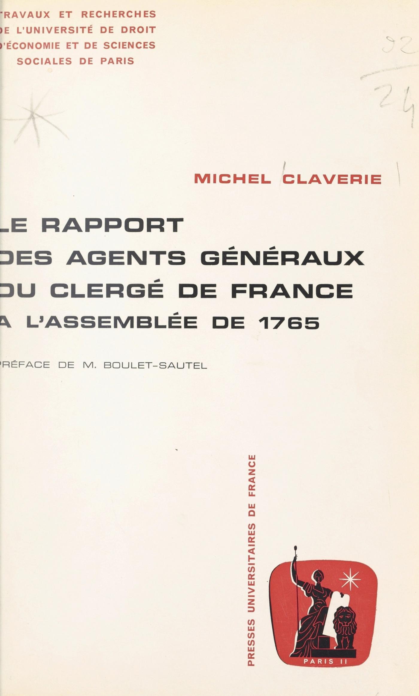 Dans la France d’Ancien Régime, l’Église est le seul Ordre du Royaume qui ait réussi à mettre sur pied une organisation représentative de ses intérêts : le Clergé de France. Cette administration, remarquable, repose essentiellement sur un organe élu, l’Assemblée générale des députés du Clergé qui se tient tous les cinq ans, et sur les mandataires immédiats de celle-ci, les deux Agents généraux. En fait, dans l’intercession toute la défense de l’Ordre repose sur les Agents généraux. Le rapport qu’ils soumettent à l’Assemblée en sortant de charge et qui renferme le compte rendu des affaires qu’ils ont expédiées se trouve donc être le reflet exact des problèmes qui se sont posés à l’Église de France pendant la période envisagée. Le rapport des abbés de Broglie et de Juigné, en 1765, ne se différencie pas formellement de ceux de leurs prédécesseurs : même partition de l’exposé en deux volets : les dossiers concernant la juridiction (c’est-à-dire l’exercice de l’autorité dans l’Église) et les dossiers concernant le temporel (c’est-à-dire la gestion financière du Clergé de France) ; même discrétion de bon ton sur le sort de beaucoup de démarches et de procédures entreprises auprès des administrations de l’État, du Ministère et du Roi. Mais les recherches effectuées par l’auteur de cette étude dans la correspondance de l’Agence générale ont permis d’éclairer d’un jour inattendu ce rapport officiel.