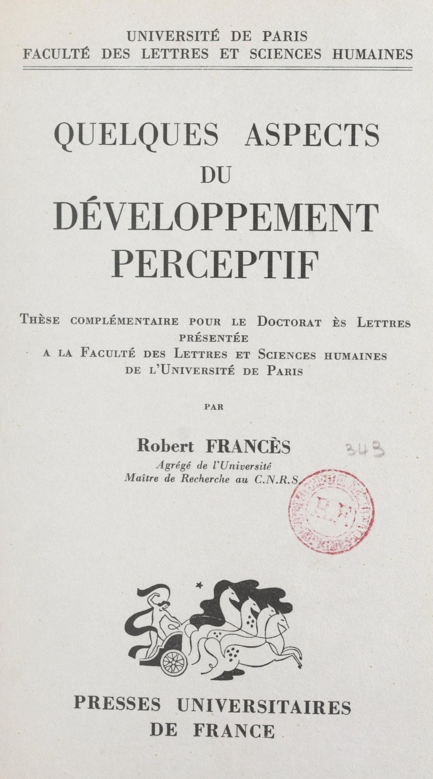 On n’a longtemps connu la perception qu’à travers ce qu’en disaient les philosophes. C’est dans la formulation de problèmes généraux légués par une longue tradition, que le psychologue d’aujourd’hui trouve quelques-uns des concepts qui font l’objet de ses propres recherches : problèmes de l’origine de la connaissance, de la vérité et de la certitude, de la réalité du monde extérieur, de la nature du monde sensible, des rapports de la perception et de l’entendement, de leur distinction ou de leur filiation possibles, du caractère actif ou passif de l’une ou de l’autre. Robert Francès, dans cette thèse présentée en 1962, revient sur les différents aspects du développement perceptif.