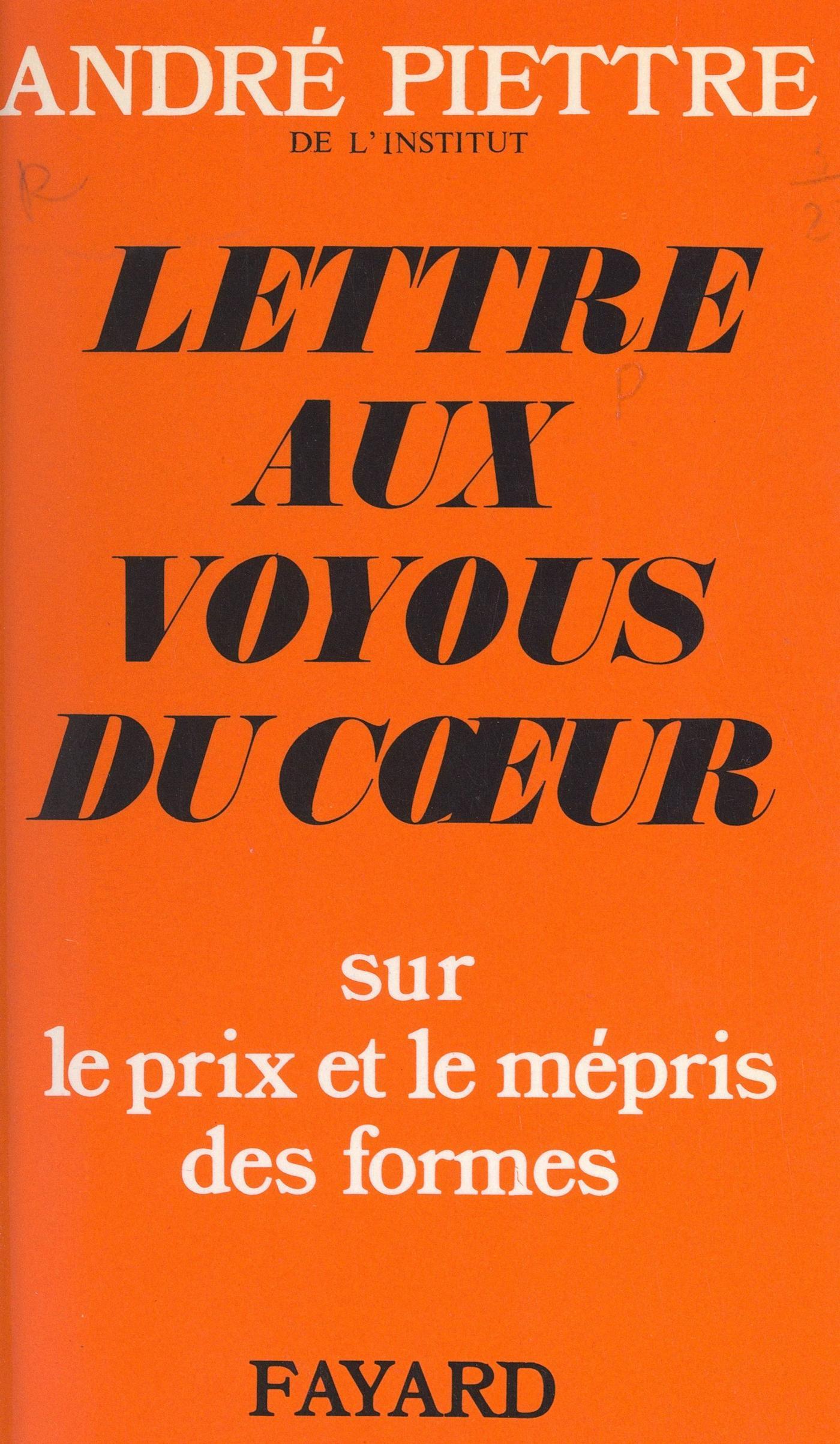 « La révolution est commencée. On ne l'arrêtera pas… ni par des policiers ou des CRS, ni par des votes massifs pour les partis « d'ordre ». Car elle est infiniment plus qu'une révolution politique. Infiniment plus qu'une révolution sociale. Plus qu'une révolution d'idées. Plus que de mœurs. Plus que d'Église. Elle est une révolution des formes (au sens le plus large de ce mot), et si vous n'arrêtez pas la dégradation de celles-ci, c'en est fait, bien avant la fin du siècle, de la cité, des familles, de la culture et de toute la société. Non pas « politique d'abord ». Mais esthétique d'abord ! » Tel est le thème qui anime cet essai.L'auteur s'adresse particulièrement aux jeunes, qu'il connaît bien. Il vise, en particulier, les généreux révoltés — laïcs et clercs — les dévoyés de la fraternité et de la sincérité, qui croient témoigner par leur vulgarité, en faveur de l'amour des hommes — et qu'il appelle pour cette raison : les voyous du cœur.Il commence par leur donner la parole, c'est-à-dire par exposer - dans leur langage direct voire brutal - leurs critiques à l'égard de la société présente. Injustice, hypocrisie, inefficacité : telles sont, à entendre certains jeunes, les vices fondamentaux que recouvrent les « formes » — celles du « beau langage », comme du vêtement ou des « manières ».Une fois dressé ce réquisitoire, l'auteur reprend la parole. « Les « formes » ou la « force » » : voilà, nous dit-il, le choix fondamental qui est au principe de toute société et de toute civilisation. La culture, la vie, les arts, la religion (et en particulier la crise actuelle de l'Église) lui en fournissent de nombreux exemples.Une conclusion de vigueur et d'optimisme clôt l'ouvrage, qui tient tout à la fois du pamphlet, de l'essai, de la lettre et du dialogue.