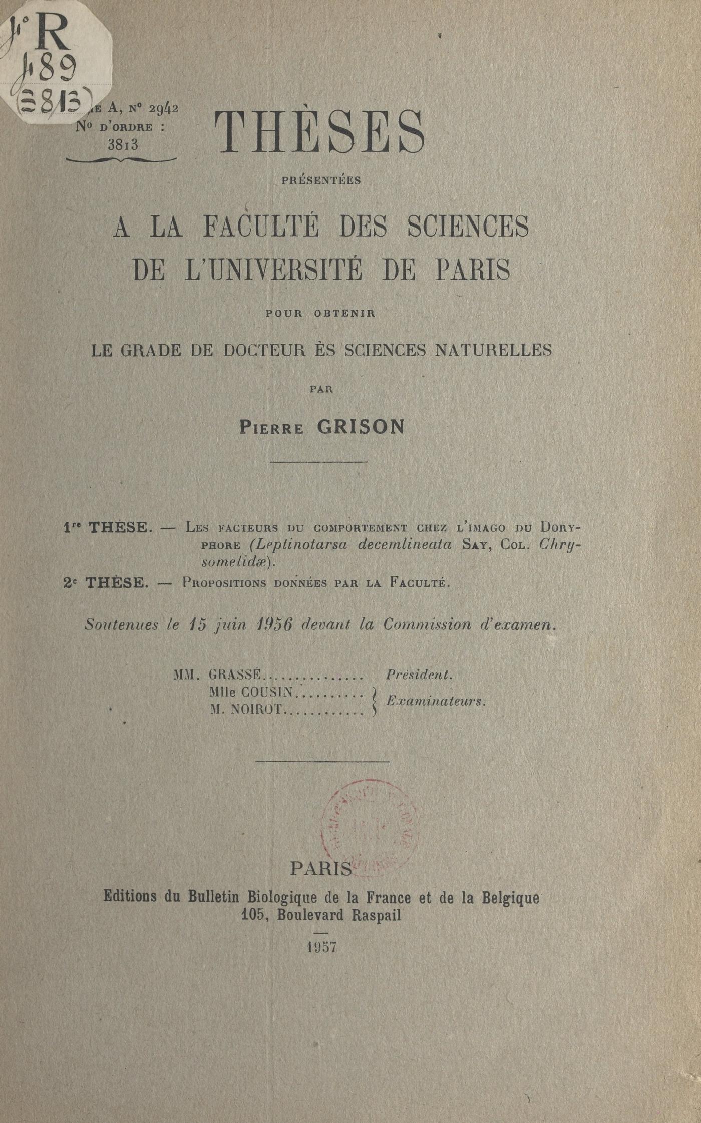 Thèses présentées à la Faculté des sciences de l'Université de Paris pour obtenir le grade de Docteur ès sciences naturelles