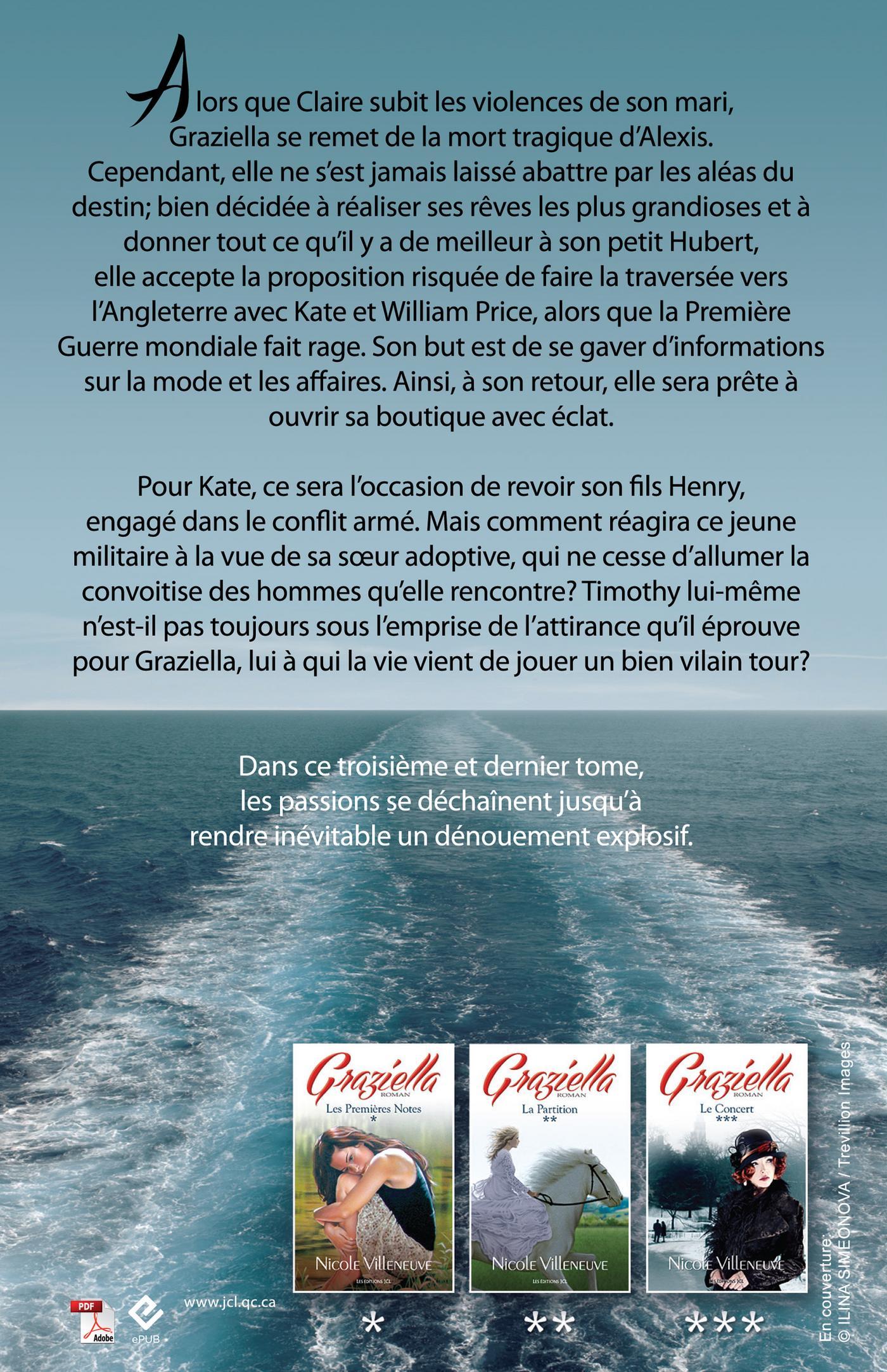 Chicoutimi, 1917. Alors que son amie Claire est coincée dans un mariage sans bonheur, Graziella a vu son avenir se transformer avec la mort d'Alexis lors d'une kermesse tenue deux ans plus tôt. Mais la jeune femme ne s'est jamais laissé abattre par les obstacles qui ont été placés sur son chemin et, dans l'intention de réaliser ses rêves et de donner tout ce qu'il y a de meilleur à son petit Hubert, elle accepte une proposition risquée. Alors que la Grande Guerre fait toujours rage en Europe, on lui propose de partir par bateau en Angleterre, avec Kate et William Price. De là, elle pourra se rendre à Londres et à Paris, afin d'étudier des notions sur la mode qui pourront lui être utiles plus tard lorsqu'elle ouvrira sa boutique de vêtements pour dames.Pour Kate, ce sera l'occasion de revoir son fils Henry, qui se bat pour la liberté dans les immondes tranchées. Mais le garçon a d'autres idées en tête lorsqu'il aperçoit enfin Graziella. Comme tous les hommes qui croisent le chemin de la belle, il en tombe follement amoureux. Toujours encline à vivre pleinement et à laisser libre cours aux pulsions qui ne sont reconnues qu'aux hommes, Graziella se laissera-t-elle séduire une fois de plus?Troisième et dernier tome d'une saga unique rédigée par Nicole Villeneuve, Graziella : Le Concert conclut avec brio une série portée à bout de bras par une jeune femme unique et attachante, au destin inoubliable.