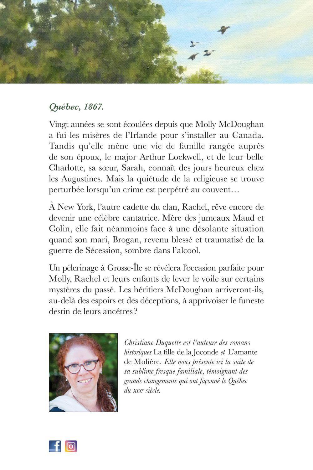 Québec, 1867.Vingt années se sont écoulées depuis que Molly McDoughan a fui les misères de l’Irlande pour s’installer au Canada. Tandis qu’elle mène une vie de famille rangée auprès de son époux, le major Arthur Lockwell, et de leur belle Charlotte, sa sœur, Sarah, connaît des jours heureux chez les Augustines. Mais la quiétude de la religieuse se trouve perturbée lorsqu’un crime est perpétré au couvent…À New York, l’autre cadette du clan, Rachel, rêve encore de devenir une célèbre cantatrice. Mère des jumeaux Maud et Colin, elle fait néanmoins face à une désolante situation quand son mari, Brogan, revenu blessé et traumatisé de la guerre de Sécession, sombre dans l’alcool.Un pèlerinage à Grosse-Île se révélera l’occasion parfaite pour Molly, Rachel et leurs enfants de lever le voile sur certains mystères du passé. Les héritiers McDoughan arriveront-ils, au-delà des espoirs et des déceptions, à apprivoiser le funeste destin de leurs ancêtres ? Christiane Duquette est l’auteure des romans historiques La fille de la Joconde et L’amante de Molière. Elle nous présente ici la suite de sa sublime fresque familiale, témoignant des grands changements qui ont façonné le Québec du XIXe siècle.