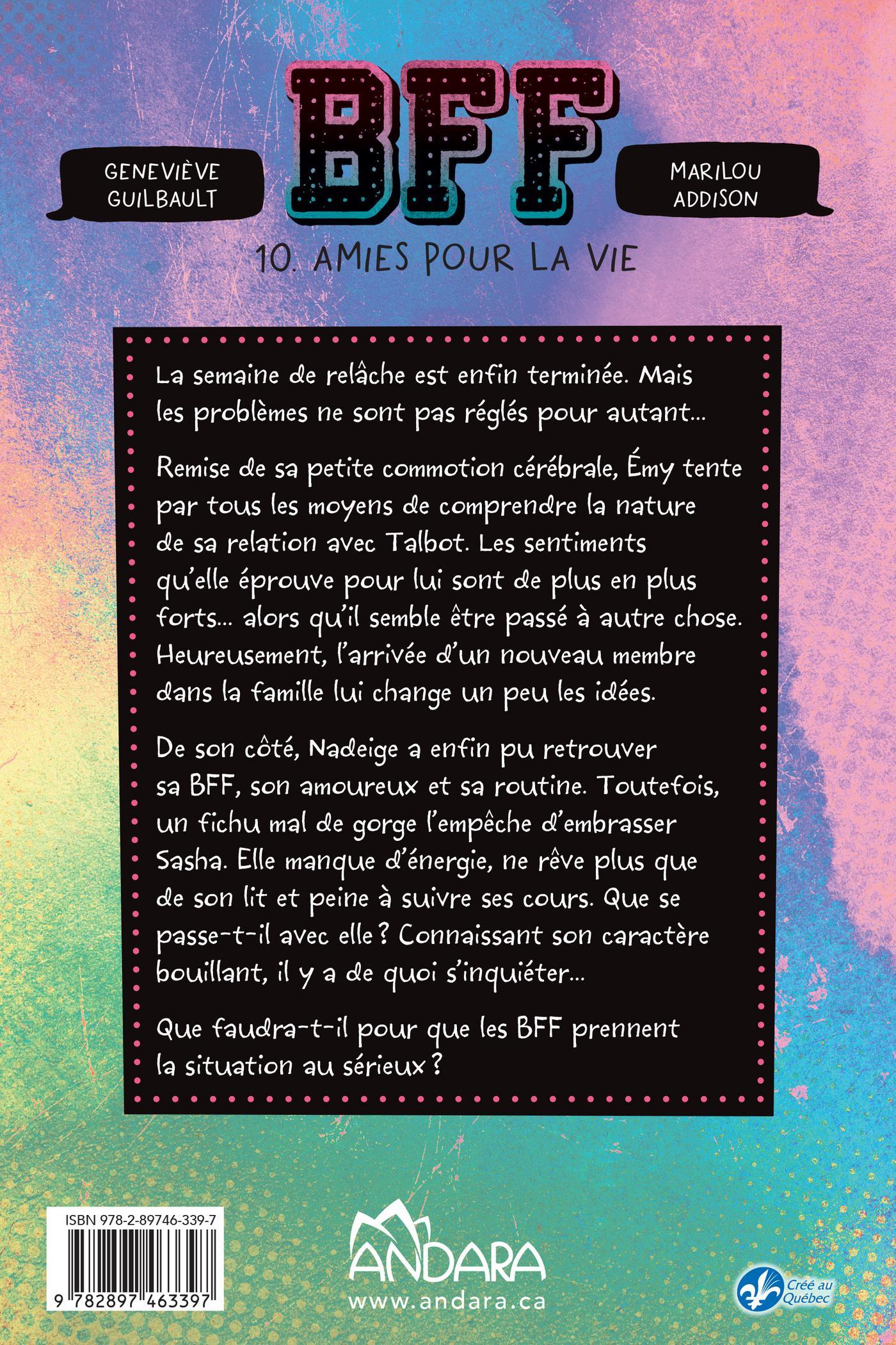 La semaine de relâche est enfin terminée. Mais les problèmes ne sont pas réglés pour autant… Remise de sa petite commotion cérébrale, Émy tente par tous les moyens de comprendre la nature de sa relation avec Talbot. Les sentiments qu’elle éprouve pour lui sont de plus en plus forts… alors qu’il semble être passé à autre chose. Heureusement, l’arrivée d’un nouveau membre dans la famille lui change un peu les idées. De son côté, Nadeige a enfin pu retrouver sa BFF, son amoureux et sa routine. Toutefois, un fichu mal de gorge l’empêche d’embrasser Sasha. Elle manque d’énergie, ne rêve plus que de son lit et peine à suivre ses cours. Que se passe-t-il avec elle ? Connaissant son caractère bouillant, il y a de quoi s’inquiéter… Que faudra-t-il pour que les BFF prennent la situation au sérieux ?