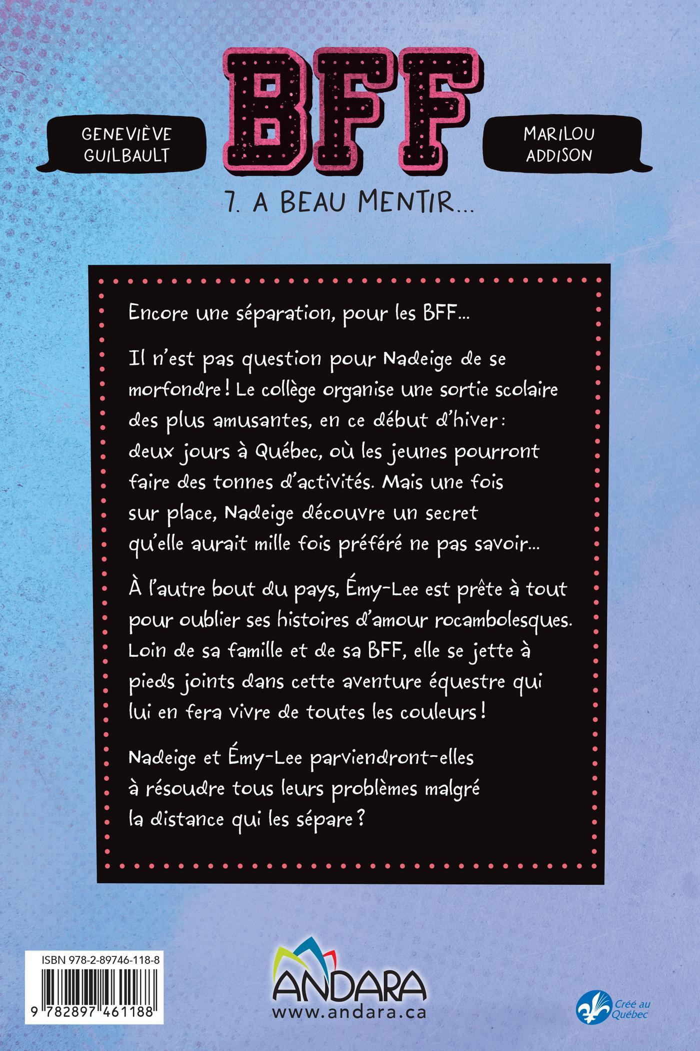 Encore une séparation, pour les BFF…Il n’est pas question pour Nadeige de se morfondre ! Le collège organise une sortie scolaire des plus amusantes, en ce début d’hiver : deux jours à Québec, où les jeunes pourront faire des tonnes d’activités ! Mais une fois sur place, Nadeige découvre un secret qu’elle aurait mille fois préféré ne pas savoir…À l’autre bout du pays, Émy-Lee est prête à tout pour oublier ses histoires d’amour rocambolesques. Loin de sa famille et de sa BFF, elle se jette à pieds joints dans cette aventure équestre qui lui en fera vivre de toutes les couleurs !Nadeige et Émy-Lee parviendront-elles à résoudre tous leurs problèmes malgré la distance qui les sépare ?