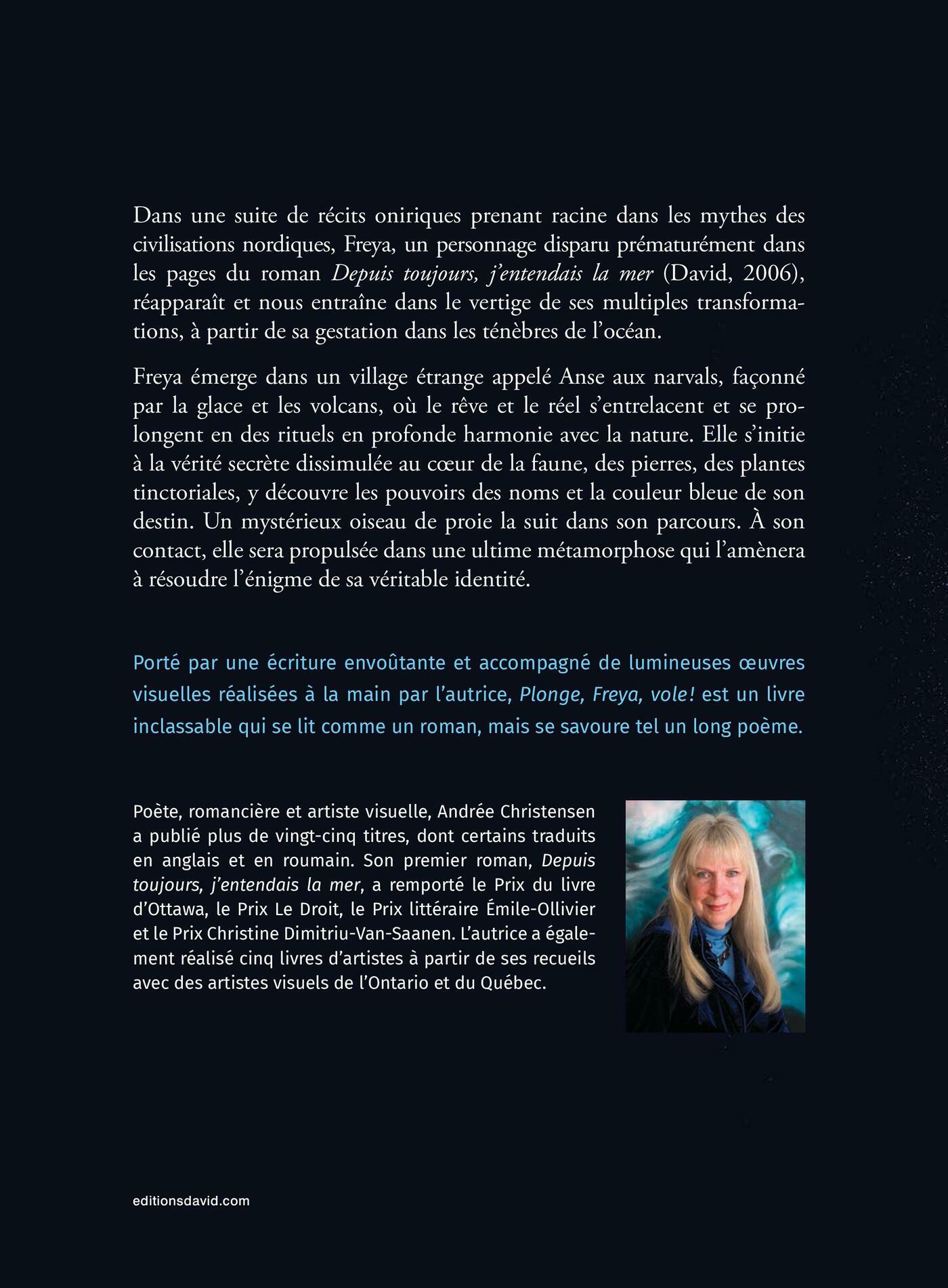 Dans une suite de récits oniriques prenant racine dans les mythes des civilisations nordiques, Freya, un personnage disparu prématurément dans les pages du roman Depuis toujours, j’entendais la mer (David, 2006), réapparaît et nous entraîne dans le vertige de ses multiples transformations, à partir de sa gestation dans les ténèbres de l’océan.Freya émerge dans un village étrange appelé Anse aux narvals, façonné par la glace et les volcans, où le rêve et le réel s’entrelacent et se prolongent en des rituels en profonde harmonie avec la nature. Elle s’initie à la vérité secrète dissimulée au cœur de la faune, des pierres, des plantes tinctoriales, y découvre les pouvoirs des noms et la couleur bleue de son destin. Un mystérieux oiseau de proie la suit dans son parcours. À son contact, elle sera propulsée dans une ultime métamorphose qui l’amènera à résoudre l’énigme de sa véritable identité.Porté par une écriture envoûtante et accompagné de lumineuses œuvres visuelles réalisées à la main par l’autrice, Plonge, Freya, vole! est un livre inclassable qui se lit comme un roman, mais se savoure tel un long poème.Poète, romancière et artiste visuelle, Andrée Christensen a publié plus de vingt-cinq titres, dont certains traduits en anglais et en roumain. Son premier roman, Depuis toujours, j’entendais la mer, a remporté le Prix du livre d’Ottawa, le Prix Le Droit, le Prix littéraire Émile-Ollivier et le Prix Christine Dimitriu-Van-Saanen. L’autrice a également réalisé cinq livres d’artistes à partir de ses recueils avec des artistes visuels de l’Ontario et du Québec.