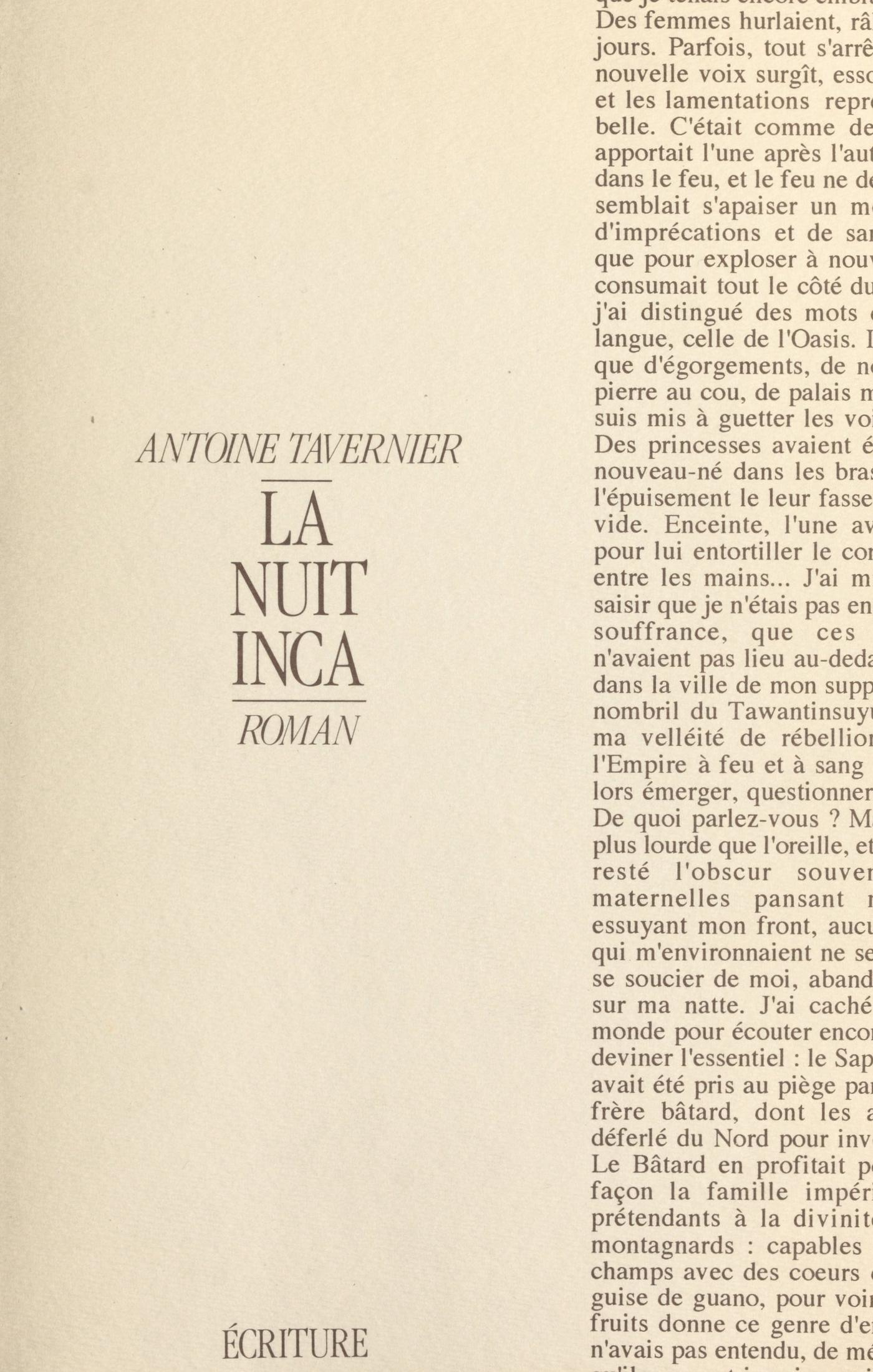Sur la côte du Pérou proche de Nazca, en 1533, un jeune indigène s’insurge contre les Incas pour sauver sa soeur. Tombant sur les premiers cavaliers espagnols dans la Cordillère, il prend ces visiteurs barbus pour des libérateurs. Grâce à Cristobal le métis, il apprend l’écriture sur le sable des plages, et devient leur interprète. Du Chili à Cuzco, il traverse les guerres entrecroisées, participe au meurtre de Pizarre, avant de se retrouver cartographe à Séville, au centre du monde. Mais la modernité naissante ne le subjuguera pas au point de lui faire oublier ses dieux oiseaux et le naufrage de son oasis natale. Et sa quête amoureuse l’ouvrira à la plus singulière des révélations... La Conquête, donc, mais racontée par un natif, tantôt émerveillé, tantôt horrifié, plus souvent narquois qu’héroïque. Bêtes et météores ne lui parlent pas moins que prêtres et guerriers. Baroque et foisonnante, la langue d’Antoine Tavernier a épousé un siècle fertile en prodiges.