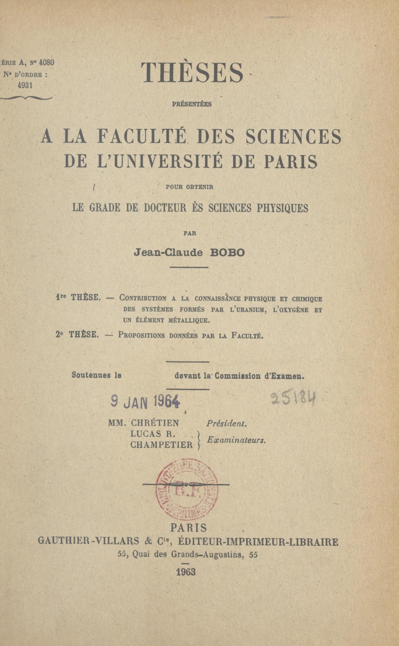 Thèse présentée à la Faculté des sciences de l'Université de Paris pour obtenir le grade de Docteur ès sciences physiques. Suivi de Propositions données par la Faculté